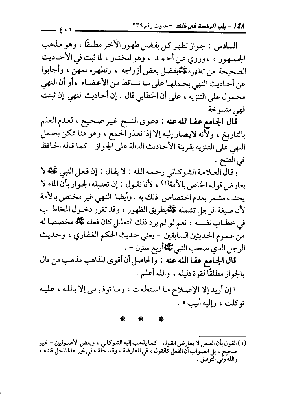 وقال العلامة الشوكاني رحمه الله: لا يقال: إن فعل النبي - صلى الله عليه وسلم - لا يعارض قوله الخاص بالأمة (¬1) , لأنا نقول: إن تعليله الجواز بأن الماء لا يجنب مشعر بعدم اختصاص ذلك به. وأيضا النهي غير مختص بالأمة لأن صيغة الرجل تشمله - صلى الله عليه وسلم - بطريق الظهور، وقد تقرر دخول المخاطب في خطاب نفسه، نعم لو لم يرد ذلك التعليل كان فعله - صلى الله عليه وسلم - مخصصا له من عموم الحديثين السابقين -يعني حديث الحكم الغفاري، وحديث الرجل الذي صحب النبي - صلى الله عليه وسلم - أربع سنين-.