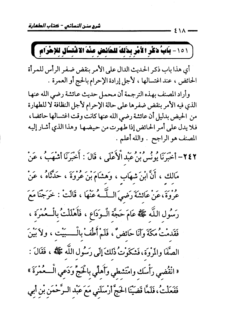 151 - بَابُ ذكْرِ الأمْرِ بِذَلِكَ للحاَئِضِ عِنْدَ الاغْتِساَلِ لِلإحْرَامِ