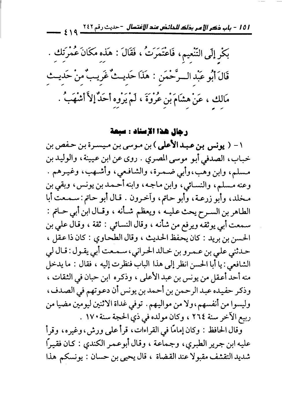 1 - (يونس بن عبد الأعلى) بن موسى بن ميسرة بن حفص بن خباب، الصدفي أبو موسى المصري. روى عن ابن عيينة، والوليد بن مسلم، وابن وهب، وأبي ضمرة، والشافعي، وأشهب، وغيرهم. وعنه مسلم، والنسائي، وابن ماجه، وابنه أحمد بن يونس، وبقي بن مخلد، وأبو زرعة، وأبو حاتم، وآخرون. قال أبو حاتم: سمعت أبا الطاهر بن السرح يحث عليه، ويعظم شأنه، وقال ابن أبي حاتم: سمعت أبي يوثقه ويرفع من شأنه، وقال النسائي: ثقة، وقال علي بن الحسن بن بريد: كان يحفظ الحديث، وقال الطحاوي: كان ذا عقل، حدثني علي بن عمرو بن خالد الحراني، سمعت أبي يقول: قال لي الشافعي: يا أبا الحسن انظر إلى هذا الباب فنظرت إليه، فقال: ما يدخل منه أحد أعقل من يونس بن عبد الأعلى، وذكره ابن حبان في الثقات، وذكر حفيده عبد الرحمن بن أحمد بن يونس أن دعوتهم في الصدف، وليسوا من أنفسهم، ولا من مواليهم. توفي غداة الاثنين ليومين مضيا من ربيع الآخر سنة 264، وكان مولده في ذي الحجة سنة 170.