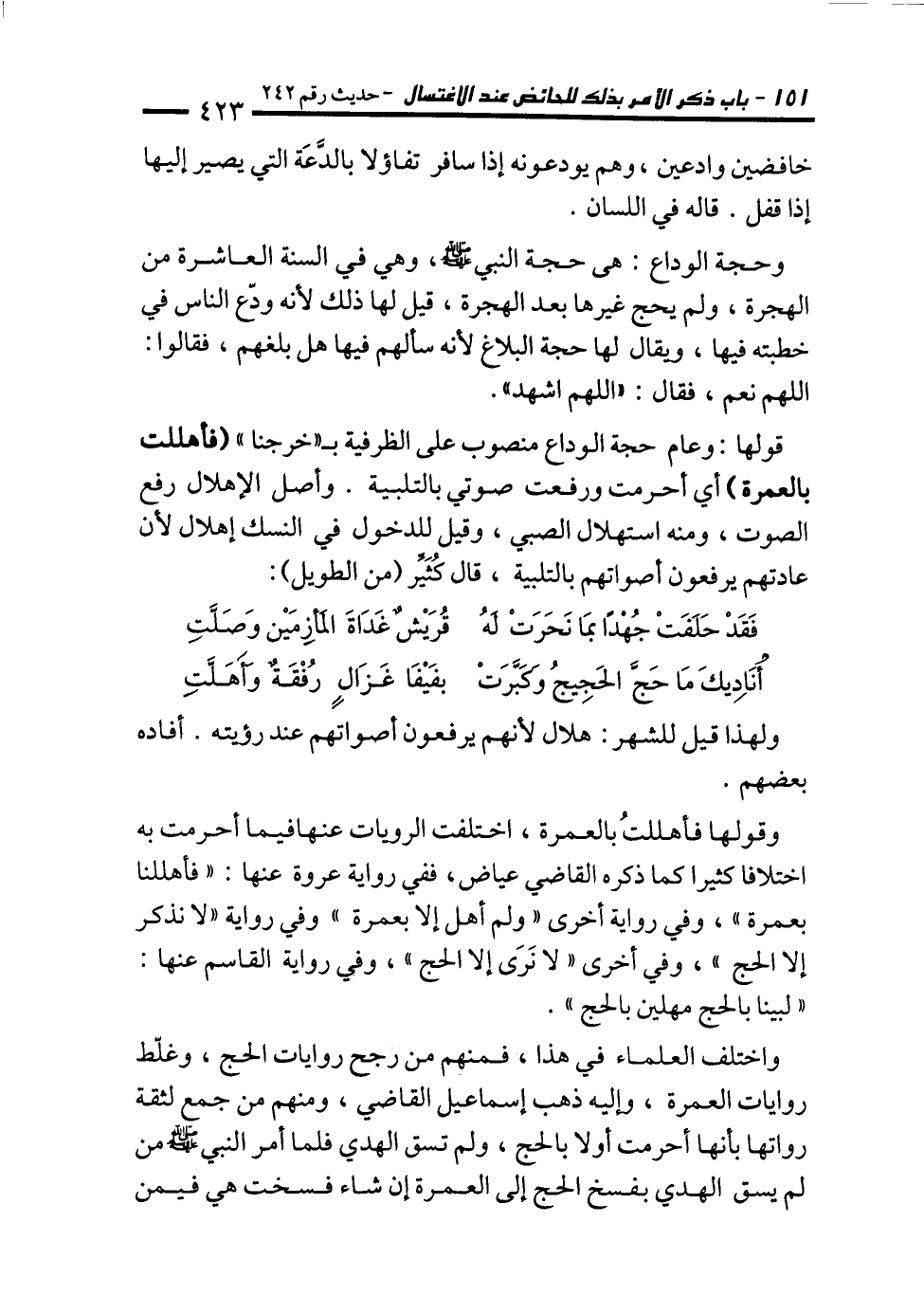 وقولها فأهللتُ بالعمرة، اختلفت الرويات عنها فيما أحرمت به اختلافا كثيرا كما ذكره القاضي عياض، ففي رواية عروة عنها: "فأهللنا بعمرة"، وفي رواية أخرى "ولم أهل إلا بعمرة" وفي رواية "لا نذكر إلا الحج"، وفي أخرى "لا نَرَى إلا الحج"، وفي رواية القاسم عنها: "لبينا بالحج مهلين بالحج".