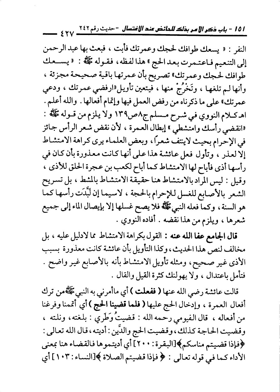 النفر: "يسعك طوافك لحجك وعمرتك فأبت، فبعث بها عبد الرحمن إلى التنعيم فاعتمرت بعد الحج" هذا لفظه، فقوله - صلى الله عليه وسلم -: "يسعك طوافك لحجك وعمرتك " تصريح بأن عمرتها باقية صحيحة مجزئة، وأنها لم تلغها، وتَخْرُجْ منها، فيتعين تأويل "ارفضي عمرتك، ودعي عمرتك، على ما ذكرناه من رفض العمل فيها وإتمام أفعالها. والله أعلم. اهـ كلام النووي في شرح مسلم ج 8 ص 139 ولا يلزم من قوله - صلى الله عليه وسلم -: "انقضي رأسك وامتشطي" إبطال العمرة, لأن نقض شعر الرأس جائز في الإحرام بحيث لا ينتف شعرًا، وبعض العلماء يرى كراهة الامتشاط إلا لعذر، وتأول فعل عائشة هذا على أنها كانت معذورة بأن كان في رأسها أذى فأباح لها الامتشاط كما أباح لكعب بن عجرة الحلق للأذى، وقيل: ليس المراد بالامتشاط هنا حقيقة الامتشاط بالمشط، بل تسريح الشعر بالأصابع للغسل للإحرام بالحجة، لاسيما إن لَبَّدَت رأسها كما هو السنة، وكما فعله النبي - صلى الله عليه وسلم - فلا يصح غسلها إلا بإيصال الماء إلى جميع شعرها، ويلزم من هذا نقضه. أفاده النووي.