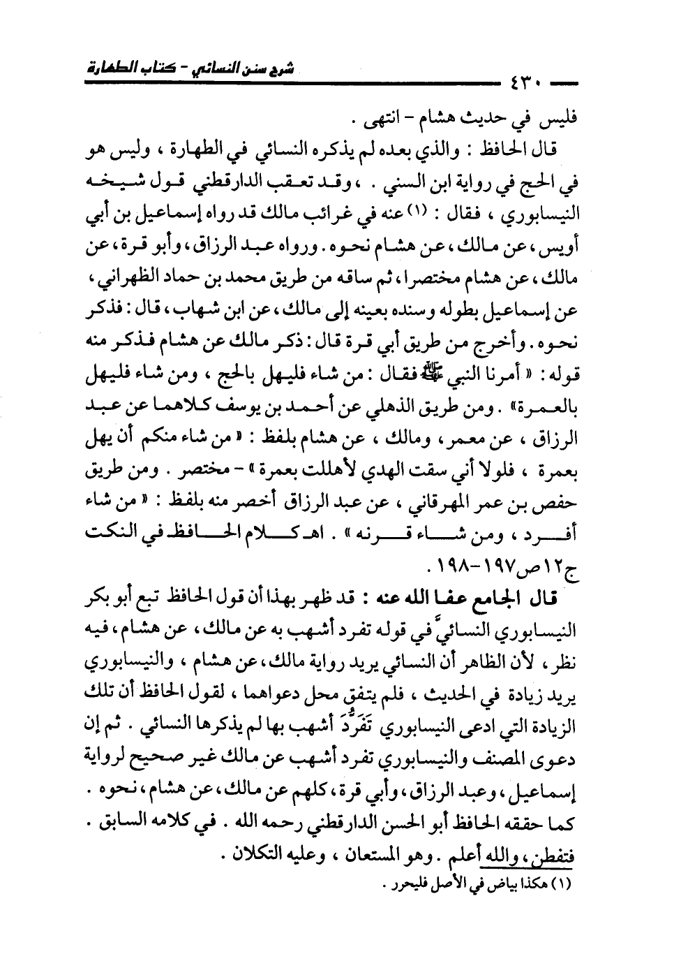 قال الحافظ: والذي بعده لم يذكره النسائي في الطهارة، وليس هو في الحج في رواية ابن السني.، وقد تعقب الدارقطني قول شيخه النيسابوري، فقال: (¬1) عنه في غرائب مالك قد رواه إسماعيل بن أبي أويس، عن مالك، عن هشام نحوه. ورواه عبد الرزاق، وأبو قرة، عن مالك، عن هشام مختصرا، ثم ساقه من طريق محمَّد بن حماد الظهراني، عن إسماعيل بطوله وسنده بعينه إلى مالك، عن ابن شهاب، قال: فذكر نحوه. وأخرج من طريق أبي قرة قال: ذكر مالك عن هشام فذكر منه قوله: "أمرنا النبي - صلى الله عليه وسلم - فقال: من شاء فليهل بالحج، ومن شاء فليهل بالعمرة". ومن طريق الذهلي عن أحمد بن يوسف كلاهما عن عبد الرزاق، عن معمر، ومالك، عن هشام بلفظ: "من شاء منكم أن يهل بعمرة، فلولا أني سقت الهدي لأهللت بعمرة"- مختصر. ومن طريق حفص بن عمر المهرقاني، عن عبد الرزاق أخصر منه بلفظ: "من شاء أفرد، ومن شاء قرنه". اهـ كلام الحافظ في النكت ج 12 ص 197 - 198.
