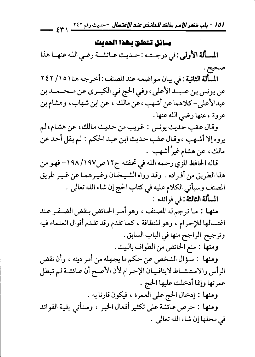 المسألة الثانية: في بيان مواضعه عند المصنف: أخرجه هنا 151/ 242 عن يونس بن عبد الأعلى، وفي الحج في الكبرى عن محمَّد بن عبد الأعلى- كلاهما عن أشهب، عن مالك، عن ابن شهاب، وهشام بن عروة، عنها رضي الله عنها.