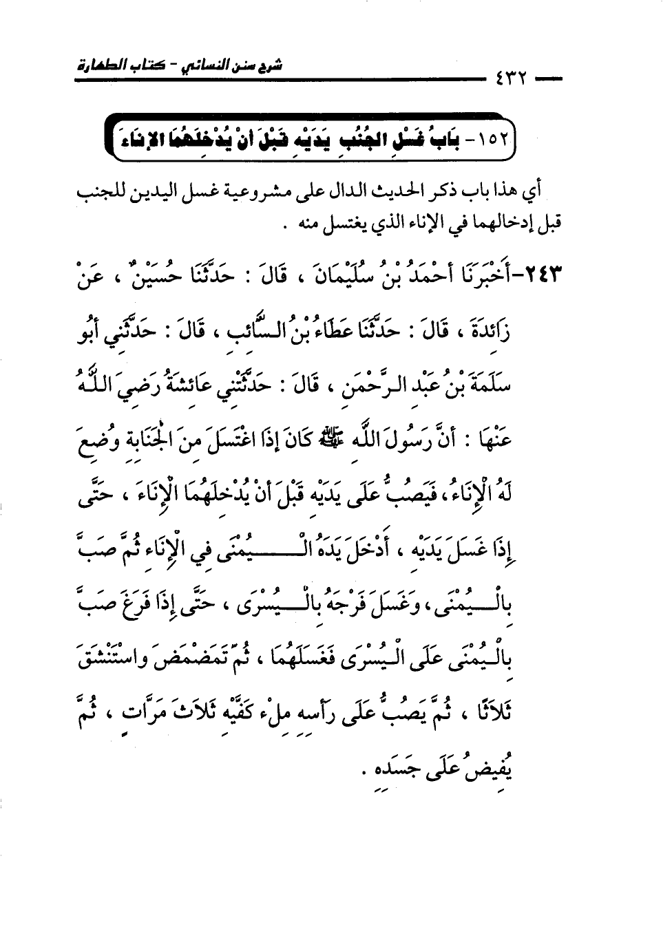 243 - أَخْبَرَنَا أَحْمَدُ بْنُ سُلَيْمَانَ، قَالَ: حَدَّثَنَا حُسَيْنٌ، عَنْ زَائِدَةَ، قَالَ: حَدَّثَنَا عَطَاءُ بْنُ السَّائِبِ، قَالَ: حَدَّثَنِي أَبُو سَلَمَةَ بْنُ عَبْدِ الرَّحْمَنِ، قَالَ: حَدَّثَتْنِي عَائِشَةُ رَضِيَ اللهُ عَنْهَا: أَنَّ رَسُولَ اللهِ - صلى الله عليه وسلم - كَانَ إِذَا اغْتَسَلَ مِنَ الْجَنَابَةِ وُضِعَ لَهُ الإِنَاءُ، فَيَصُبُّ عَلَى يَدَيْهِ قَبْلَ أَنْ يُدْخِلَهُمَا الإِنَاءَ، حَتَّى إِذَا غَسَلَ يَدَيْهِ، أَدْخَلَ يَدَهُ الْيُمْنَى فِي الإِنَاءِ ثُمَّ صَبَّ بِالْيُمْنَى، وَغَسَلَ فَرْجَهُ بِالْيُسْرَى حَتَّى إِذَا فَرَغَ صَبَّ بِالْيُمْنَى عَلَى الْيُسْرَى فَغَسَلَهُمَا ثُمَّ تَمَضْمَضَ وَاسْتَنْشَقَ ثَلاَثًا ثُمَّ يَصُبُّ عَلَى رَأْسِهِ مِلْءَ كَفَّيْهِ ثَلاَثَ مَرَّاتٍ ثُمَّ يُفِيضُ عَلَى جَسَدِهِ.