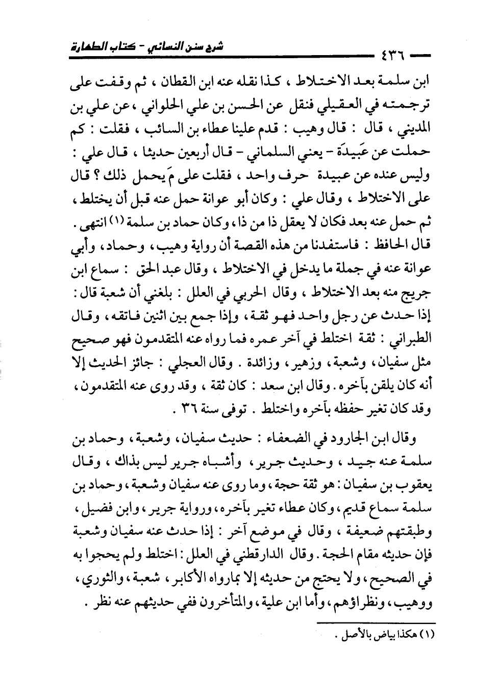 ابن سلمة بعد الاختلاط، كذا نقله عنه ابن القطان، ثم وقفت على ترجمته في العقيلي فنقل عن الحسن بن علي الحلواني، عن علي بن المديني، قال: قال وهيب: قدم علينا عطاء بن السائب، فقلت: كم حملت عن عَبيدَة -يعني السلماني- قال أربعين حديثا، قال علي: وليس عنده عن عبيدة حرف واحد، فقلت على مَ يحمل ذلك؟ قال على الاختلاط، وقال علي: وكان أبو عوانة حمل عنه قبل أن يختلط، ثم حمل عنه بعد فكان لا يعقل ذا من ذا، وكان حماد بن سلمة (¬1) انتهى. قال الحافظ: فاستفدنا من هذه القصة أن رواية وهيب، وحماد، وأبي عوانة عنه في جملة ما يدخل في الاختلاط، وقال عبد الحق: سماع ابن جريج منه بعد الاختلاط، وقال الحربي في العلل: بلغني أن شعبة قال: إذا حدث عن رجل واحد فهو ثقة، وإذا جمع بين اثنين فاتقه، وقال الطبراني: ثقة اختلط في آخر عمره فما رواه عنه المتقدمون فهو صحيح مثل سفيان، وشعبة، وزهير، وزائدة. وقال العجلي: جائز الحديث إلا أنه كان يلقن بآخره. وقال ابن سعد: كان ثقة، وقد روى عنه المتقدمون، وقد كان تغير حفظه بآخره واختلط. توفي سنة 36.