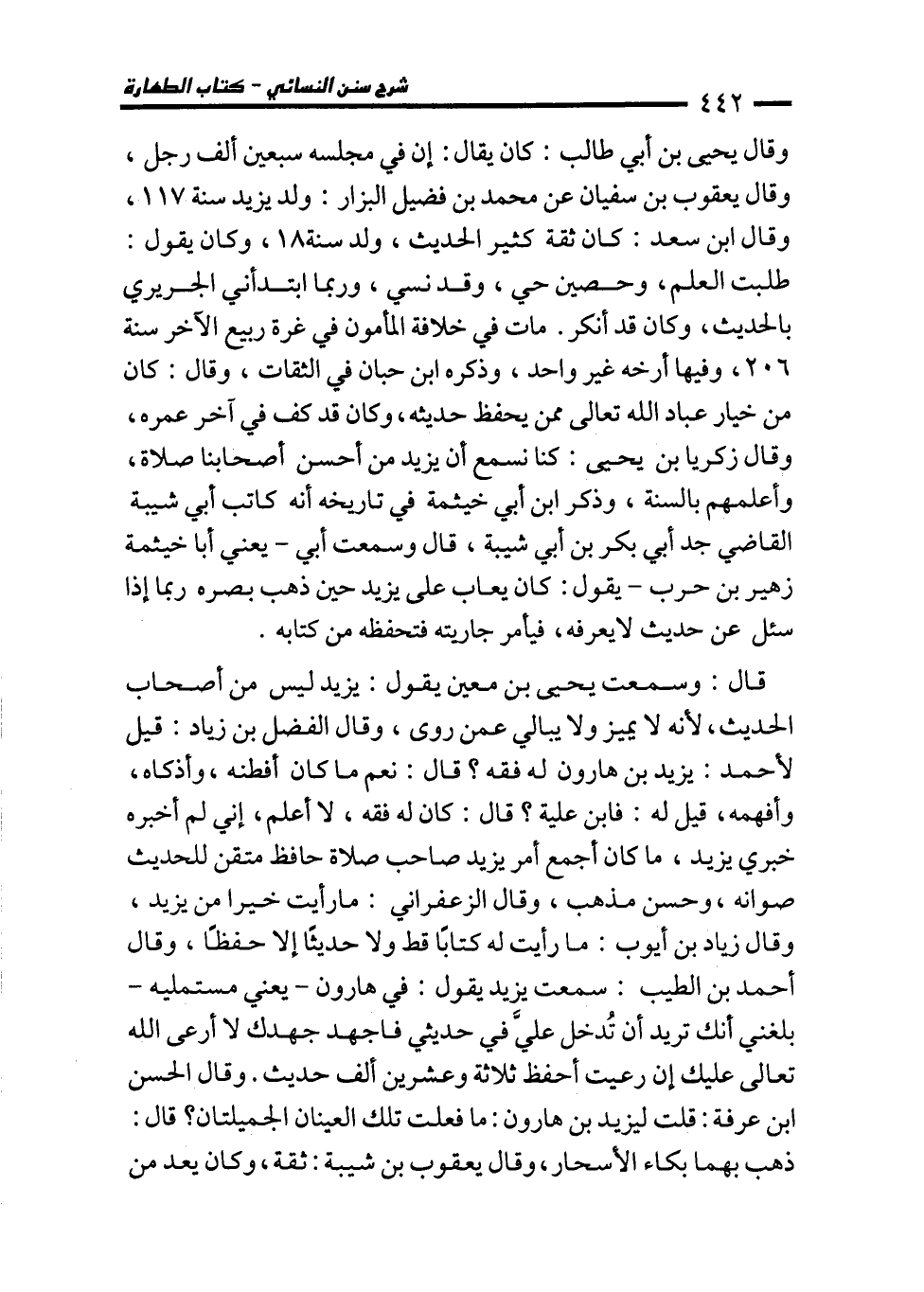 وقال يحيى بن أبي طالب: كان يقال: إن في مجلسه سبعين ألف رجل، وقال يعقوب بن سفيان عن محمَّد بن فضيل البزار: ولد يزيد سنة 117، وقال ابن سعد: كان ثقة كثير الحديث، ولد سنة 18، وكان يقول: طلبت العلم، وحصين حي، وقد نسي، وربما ابتدأني الجريري بالحديث، وكان قد أنكر. مات في خلافة المأمون في غرة ربيع الآخر سنة 206، وفيها أرخه غير واحد، وذكره ابن حبان في الثقات، وقال: كان من خيار عباد الله تعالى ممن يحفظ حديثه، وكان قد كف في آخر عمره، وقال زكريا بن يحيى: كنا نسمع أن يؤيد من أحسن أصحابنا صلاة، وأعلمهم بالسنة، وذكر ابن أبي خيثمة في تاريخه أنه كاتب أبي شيبة القاضي جد أبي بكر بن أبي شيبة، قال وسمعت أبي -يعني أبا خيثمة زهير بن حرب- يقول: كان يعاب على يزيد حين ذهب بصره ربما إذا سئل عن حديث لا يعرفه، فيأمر جاريته فتحفظه من كتابه.