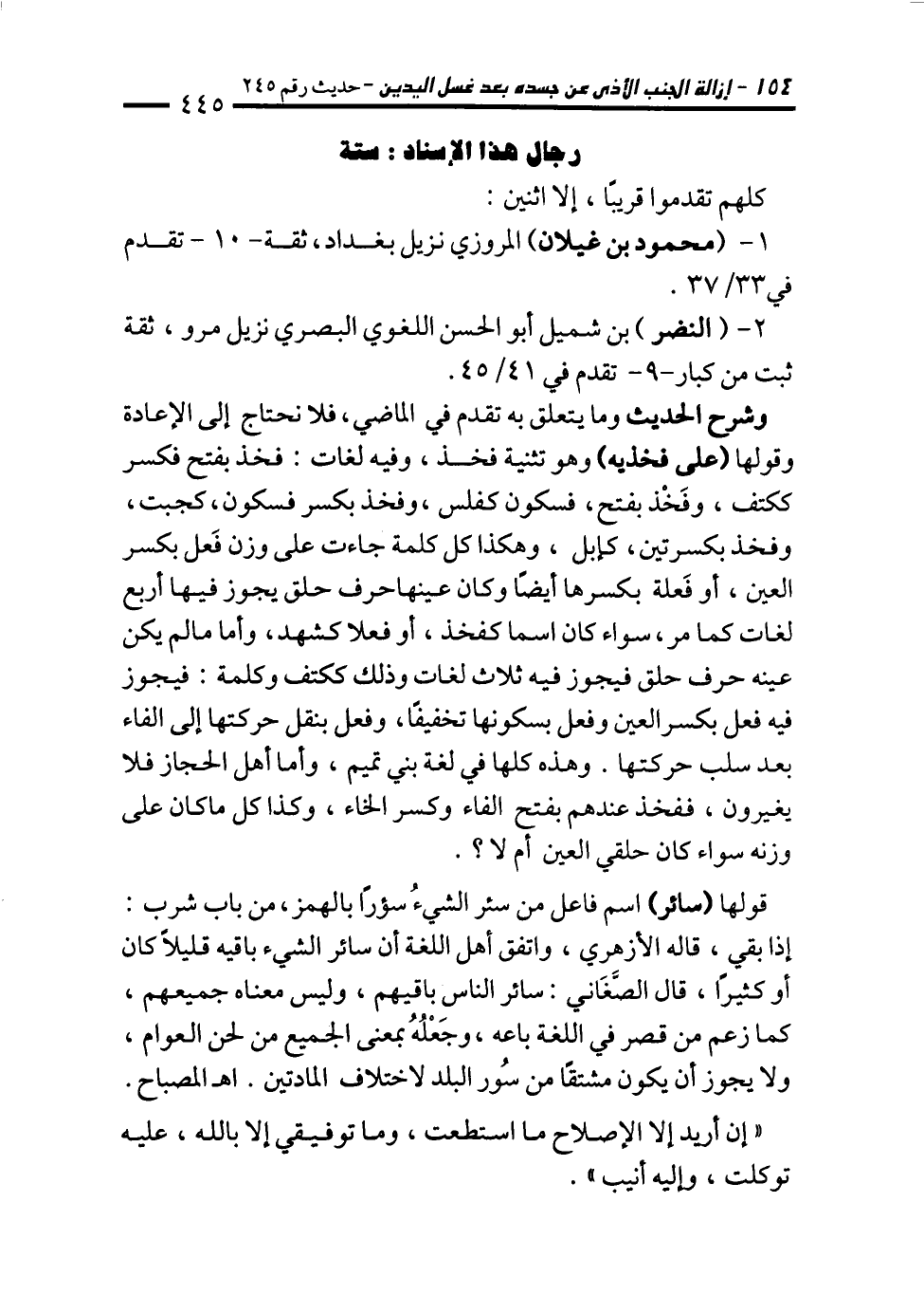 قولها (سائر) اسم فاعل من سئر الشيءُ سؤرًا بالهمز، من باب شرب: إذا بقي، قاله الأزهري، واتفق أهل اللغة أن سائر الشيء باقيه قليلًا كان أو كثيرًا، قال الصَّغَاني: سائر الناس باقيهم، وليس معناه جميعهم، كما زعم من قصر في اللغة باعه، وجَعْلُهُ بمعنى الجميع من لحن العوام، ولا يجوز أن يكون مشتقًا من سُور البلد لاختلاف المادتين. اهـ المصباح.