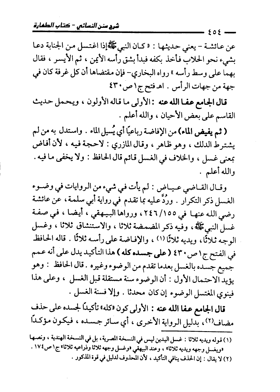 وقال القاضي عياض: لم يأت في شيء من الروايات في وضوء الغسل ذكر التكرار. ورُدَّ عليه بما تقدم في رواية أبي سلمة، عن عائشة رضي الله عنها في 155/ 246، ورواها البيهقي، أيضا، في صفة غسل النبي - صلى الله عليه وسلم -، وفيه ذكر المضمضة ثلاثا، والاستنشاق ثلاثا، وغسل الوجه ثلاثا، ويديه ثلاثًا (¬1)، والإفاضة على رأسه ثلاثًا. قاله الحافظ في الفتح ج 1 ص 430 (على جسده كله) هذا التأكيد يدل على أنه عمم جميع جسده بالغسل بعدما تقدم من الوضوء وغيره. قال الحافظ: وهو يؤيد الاحتمال الأول: أن الوضوء سنة مستقلة قبل الغسل، وعلى هذا فينوي المغتسل الوضوء إن كان محدثا. وإلا فسنة الغسل.