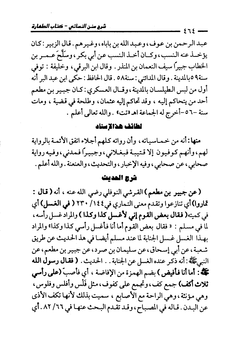 (عن جبير بن مطعم) القرشي النوفلي رضي الله عنه، أنه (قال: تماروا) أي تنازعوا وتقدم معنى التماري في 144/ 230 (في الغسل) أي في كميته (فقال بعض القوم إني لأغسل كذا وكذا) والمراد غسل رأسه، لما في مسلم: "فقال بعض القوم أما أنا فأغسل رأسي كذا وكذا" والمراد بهذا الغسل غسل الجنابة لما عند مسلم أيضا في هذ الحديث عن طريق شعبة، عن أبي إسحاق، عن سليمان بن صرد، عن جبير بن مطعم، عن النبي - صلى الله عليه وسلم -: أنه ذكر عنده الغسل عن الجنابة .. الحديث. (فقال رسول الله - صلى الله عليه وسلم -: أما أنا فأفيض) بضم الهمزة من الإفاضة، أي فأصبّ (على رأسي ثلاث أكف) جمع كف، وتجمع على كفوف، مثل فَلْس وأفلس وفلوس، وهي مؤنثة، وهي الراحة مع الأصابع، سميت بذلك لأنها تكف الأذى عن البدن. قاله في المصباح، وقد تقدم البحث عنها في 66/ 82. أي