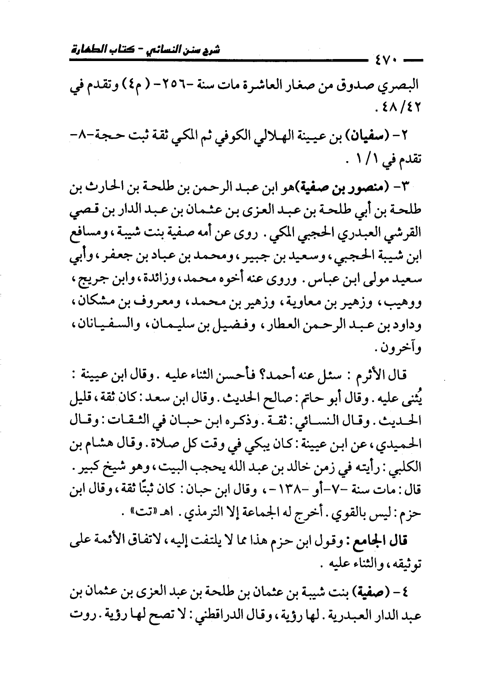 3 - (منصور بن صفية) هو ابن عبد الرحمن بن طلحة بن الحارث بن طلحة بن أبي طلحة بن عبد العزى بن عثمان بن عبد الدار بن قصي القرشي العبدري الحجبي المكي. روى عن أمه صفية بنت شيبة، ومسافع ابن شيبة الحجبي، وسعيد بن جبير، ومحمد بن عباد بن جعفر، وأبي سعيد مولى ابن عباس. وروى عنه أخوه محمَّد، وزائدة، وابن جريج، ووهيب، وزهير بن معاوية، وزهير بن محمَّد، ومعروف بن مشكان، وداود بن عبد الرحمن العطار، وفضيل بن سليمان، والسفيانان، وآخرون.