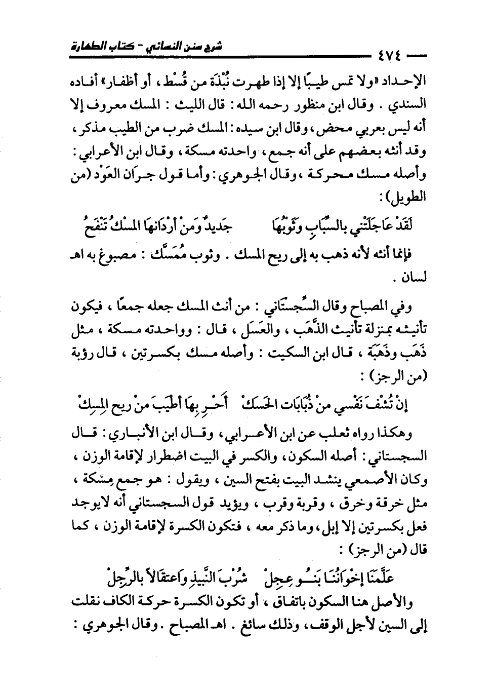 الإحداد "ولا تمس طيبًا إلا إذا طهرت نُبْذَة من قُسْط، أو أظفار" أفاده السندي. وقال ابن منظور رحمه الله: قال الليث: المسك معروف إلا أنه ليس بعربي محض، وقال ابن سيده: المسك ضرب من الطيب مذكر، وقد أنثه بعضهم على أنه جمع، واحدته مسكة، وقال ابن الأعرابي: وأصله مسك محركة، وقال الجوهري: وأما قول جرَان العَوْد (من الطويل):