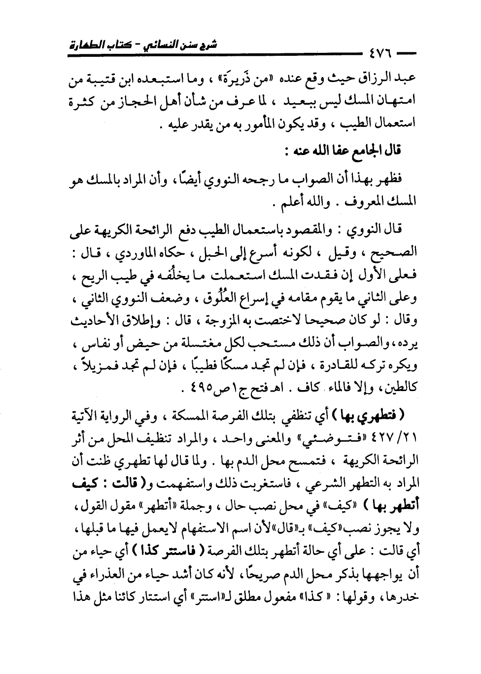فظهر بهذا أن الصواب ما رجحه النووي أيضًا، وأن المراد بالمسك هو المسك المعروف. والله أعلم. قال النووي: والمقصود باستعمال الطيب دفع الرائحة الكريهة على الصحيح، وقيل، لكونه أسرع إلى الحبل، حكاه الماوردي، قال: فعلى الأول إن فقدت المسك استعملت ما يخلُفه في طيب الريح، وعلى الثاني ما يقوم مقامه في إسراع العُلُوق، وضعف النووي الثاني، وقال: لو كان صحيحا لاختصت به المزوجة، قال: وإطلاق الأحاديث يرده، والصواب أن ذلك مستحب لكل مغتسلة من حيض أو نفاس، ويكره تركه للقادرة، فإن لم تجد مسكًا فطيبًا، فإن لم تجد فمزيلًا، كالطين، وإلا فالماء كاف. اهـ فتح ج 1 ص 495.