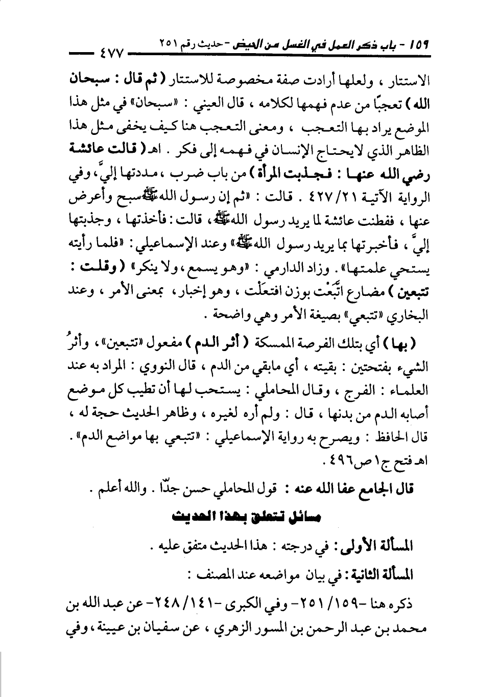 الاستتار، ولعلها أرادت صفة مخصوصة للاستتار (ثم قال: سبحان الله) تعجبًا من عدم فهمها لكلامه، قال العيني: "سبحان" في مثل هذا الموضع يراد بها التعجب، ومعنى التعجب هنا كيف يخفى مثل هذا الظاهر الذي لا يحتاج الإنسان في فهمه إلى فكر. اهـ (قالت عائشة رضي الله عنها: فجذبت المرأة) من باب ضرب، مددتها إليَّ، وفي الرواية الآتية 21/ 427. قالت: "ثم إن رسول الله - صلى الله عليه وسلم - سبح وأعرض عنها، ففطنت عائشة لما يريد رسول الله - صلى الله عليه وسلم -، قالت: فأخذتها، وجذبتها إليَّ، فأخبرتها بما يريد رسول الله - صلى الله عليه وسلم - وعند الإسماعيلي: "فلما رأيته يستحي علمتها". وزاد الدارمي: "وهو يسمع، ولا ينكر" (وقلت: تتبعين) مضارع اتَّبَعْت بوزن افتعَلْت، وهو إخبار، بمعنى الأمر، وعند البخاري "تتبعي" بصيغة الأمر وهي واضحة.