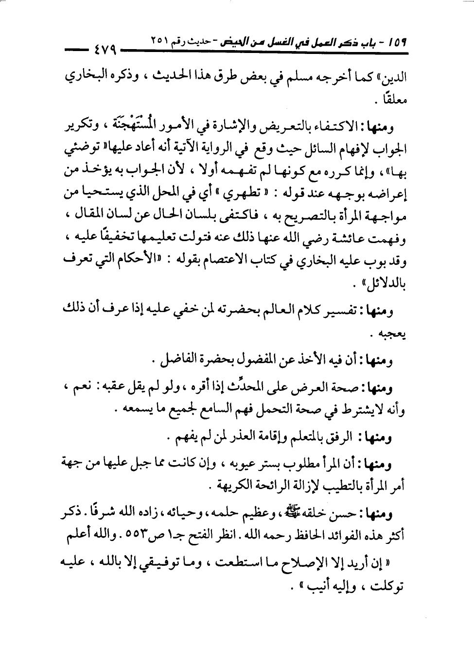 ومنها: الاكتفاء بالتعريض والإشارة في الأمور المُسْتَهْجَنَة، وتكرير الجواب لإفهام السائل حيث وقع في الرواية الآتية أنه أعاد عليها "توضئي بها"، وإنما كرره مع كونها لم تفهمه أولا؛ لأن الجواب به يؤخذ من إعراضه بوجهه عند قوله: "تطهري" أي في المحل الذي يستحيا من مواجهة المرأة بالتصريح به، فاكتفى بلسان الحال عن لسان المقال، وفهمت عائشة رضي الله عنها ذلك عنه فتولت تعليمها تخفيفًا عليه، وقد بوب عليه البخاري في كتاب الاعتصام بنوله: "الأحكام التي تعرف بالدلائل".