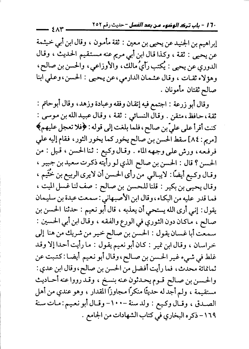 وقال يحيى بن بكير: قلنا للحسن بن صالح: صف لنا غسل الميت، فما قدر عليه من البكاء، وقال ابن الأصبهاني: سمعت عبدة بن سليمان يقول: إني أرى الله يستحي أن يعذبه، قال أبو نعيم: حدثنا الحسن بن صالح، ما كان دون الثوري في الورع والفقه، وقال ابن أبي الحسين: سمعت أبا غسان يقول: الحسن بن صالح خير من شريك من هنا إلى خراسان، وقال ابن نمير: كان أبو نعيم يقول: ما رأيت أحدا إلا وقد غلط في شيء غير الحسن بن صالح، وقال أبو نعيم أيضا: كتبت عن ثمانمائة محدث، فما رأيت أفضل من الحسن بن صالح، وقال ابن عدي: والحسن بن صالح قوم يحدثون عنه بنسخ، وقد رووا عنه أحاديث مستقيمة، ولم أجد له حديثًا منكرًا مجاوزًا المقدار, وهو عندي من أهل الصدق، وقال وكيع: ولد سنة -100 - وقال أبو نعيم: مات سنة 169 - ذكره البخاري في كتاب الشهادات من الجامع.