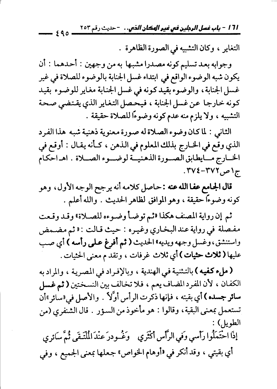 وجوابه بعد تسليم كونه مصدرا مشبها به من وجهين: أحدهما: أن يكون شبه الوضوء الواقع في ابتداء غسل الجنابة بالوضوء للصلاة في غير غسل الجنابة، والوضوء بقيد كونه في غسل الجنابة مغاير للوضوء بقيد كونه خارجا عن غسل الجنابة، فيحصل التغاير الذي يقتضي صحة التشبيه، ولا يلزم منه عدم كونه وضوءًا للصلاة حقيقة.