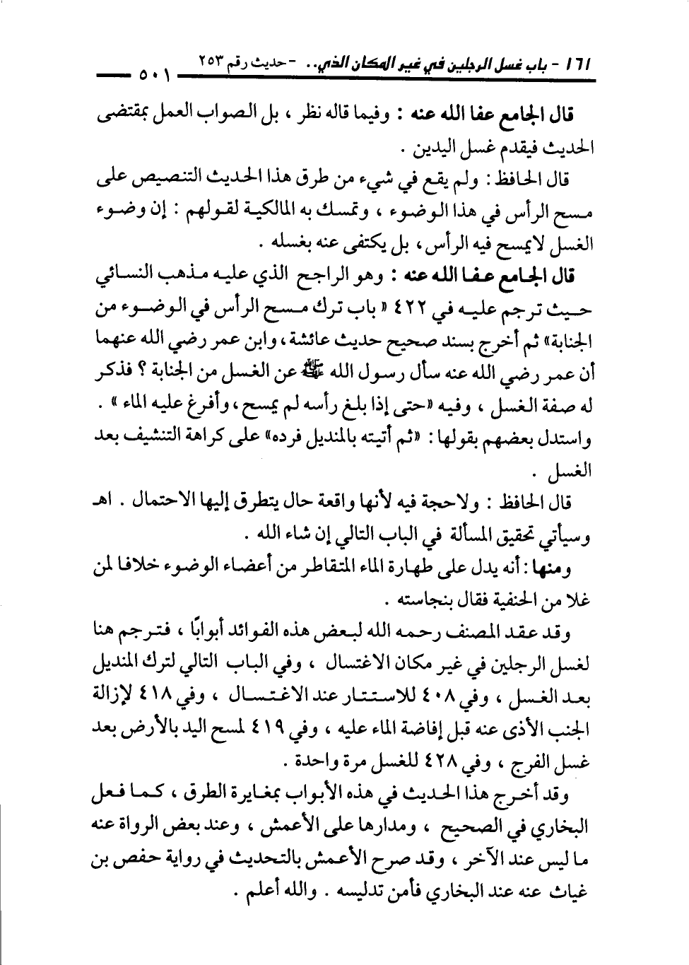 قال الجامع عفا الله عنه: وهو الراجح الذي عليه مذهب النسائي حيث ترجم عليه في 422 "باب ترك مسح الرأس في الوضوء من الجنابة" ثم أخرج بسند صحيح حديث عائشة، وابن عمر رضي الله عنهما أن عمر رضي الله عنه سأل رسول الله - صلى الله عليه وسلم - عن الغسل من الجنابة؟ فذكر