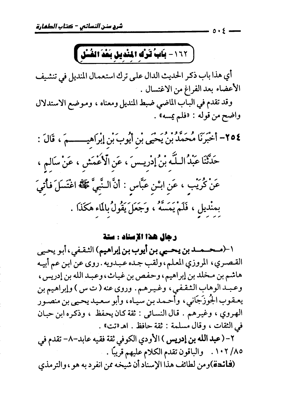 254 - أَخْبَرَنَا مُحَمَّدُ بْنُ يَحْيَى بْنِ أَيُّوبَ بْنِ إِبْرَاهِيمَ، قَالَ: حَدَّثَنَا عَبْدُ اللهِ بْنُ إِدْرِيسَ، عَنِ الأَعْمَشِ، عَنْ سَالِمٍ، عَنْ كُرَيْبٍ، عَنِ ابْنِ عَبَّاسٍ: أَنَّ النَّبِيَّ - صلى الله عليه وسلم - اغْتَسَلَ فَأُتِيَ بِمِنْدِيلٍ فَلَمْ يَمَسَّهُ وَجَعَلَ يَقُولُ بِالْمَاءِ هَكَذَا.