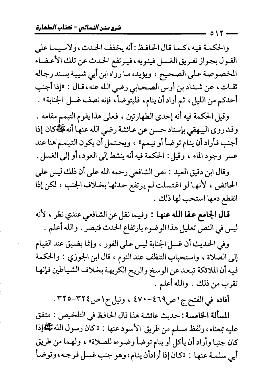 المسألة الخامسة: حديث عائشة هذا قال الحافظ في التلخيص: متفق عليه بمعناه، ولفظ مسلم من طريق الأسود عنها: "كان رسول الله - صلى الله عليه وسلم - إذا كان جنبا وأراد أن يأكل أو ينام توضأ وضوءه للصلاة"، ولهما من طريق أبي سلمة عنها: "كان إذا أراد أن ينام، وهو جنب غسل فرجه، وتوضأ