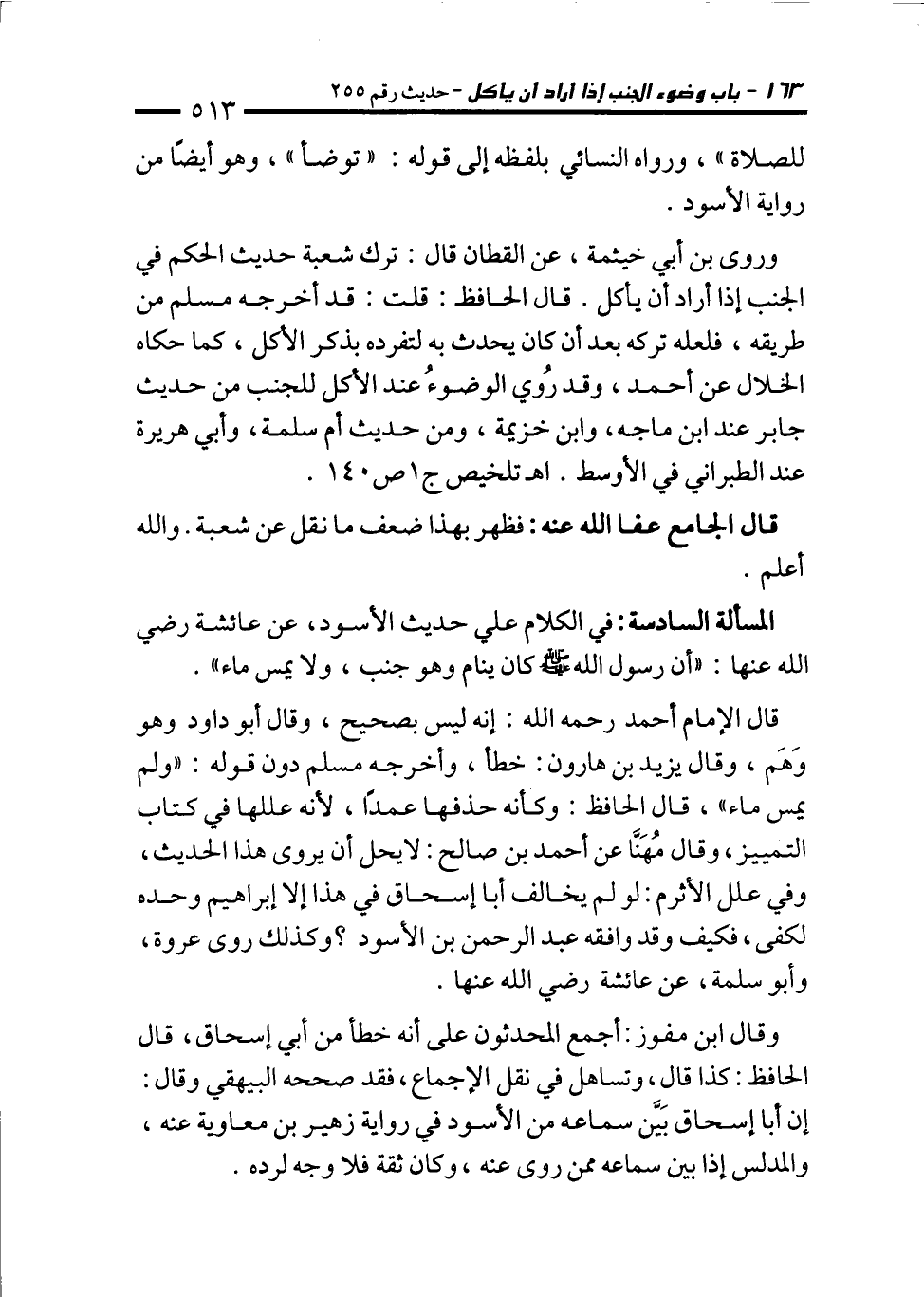 المسألة السادسة: في الكلام علي حديث الأسود، عن عائشة رضي الله عنها: "أن رسول الله - صلى الله عليه وسلم - كان ينام وهو جنب، ولا يمس ماء".
