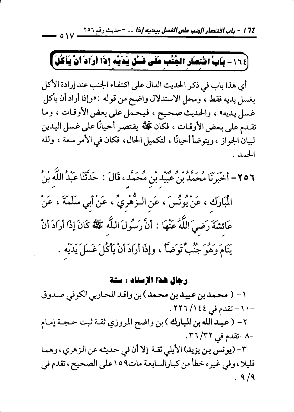 256 - أَخْبَرَنَا مُحَمَّدُ بْنُ عُبَيْدِ بْنِ مُحَمَّدٍ، قَالَ: حَدَّثَنَا عَبْدُ اللهِ بْنُ الْمُبَارَكِ، عَنْ يُونُسَ، عَنِ الزُّهْرِيِّ، عَنْ أَبِي سَلَمَةَ، عَنْ عَائِشَةَ رَضِيَ اللهُ عَنْهَا: أَنَّ رَسُولَ اللهِ - صلى الله عليه وسلم - كَانَ إِذَا أَرَادَ أَنْ يَنَامَ وَهُوَ جُنُبٌ تَوَضَّأَ، وَإِذَا أَرَادَ أَنْ يَأْكُلَ غَسَلَ يَدَيْهِ.