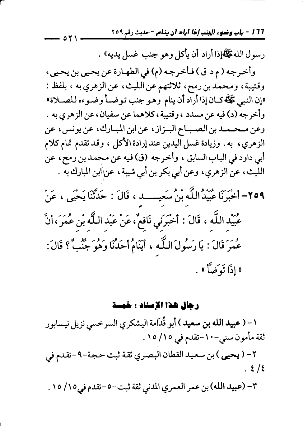 259 - أَخْبَرَنَا عُبَيْدُ اللهِ بْنُ سَعِيدٍ، قَالَ: حَدَّثَنَا يَحْيَى، عَنْ عُبَيْدِ اللهِ، قَالَ: أَخْبَرَنِي نَافِعٌ، عَنْ عَبْدِ اللهِ بْنِ عُمَرَ، أَنَّ عُمَرَ قَالَ: يَا رَسُولَ اللهِ، أَيَنَامُ أَحَدُنَا وَهُوَ جُنُبٌ؟ قَالَ: "إِذَا تَوَضَّأَ".