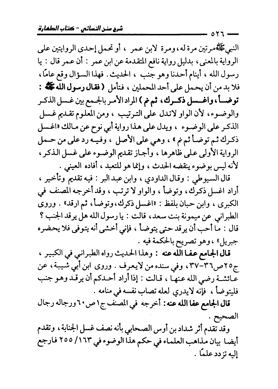 قال السيوطي: وقال الداودي، وابن عبد البر: فيه تقديم وتأخير، أراد اغسل ذكرك، وتوضأ، والواو لا ترتب، وقد أخرجه المصنف في "الكبرى" وابن حبان بلفظ: "اغسل ذكرك، وتوضأ، ثم ارقد". وروى الطبراني عن ميمونة بنت سعد، قالت: يا رسول الله هل يرقد الجنب؟ قال: ما أحب أن يرقد حتى يتوضأ، فإني أخشى أنه يتوفى فلا يحضره جبريل"، وهو تصريح بالحكمة فيه.