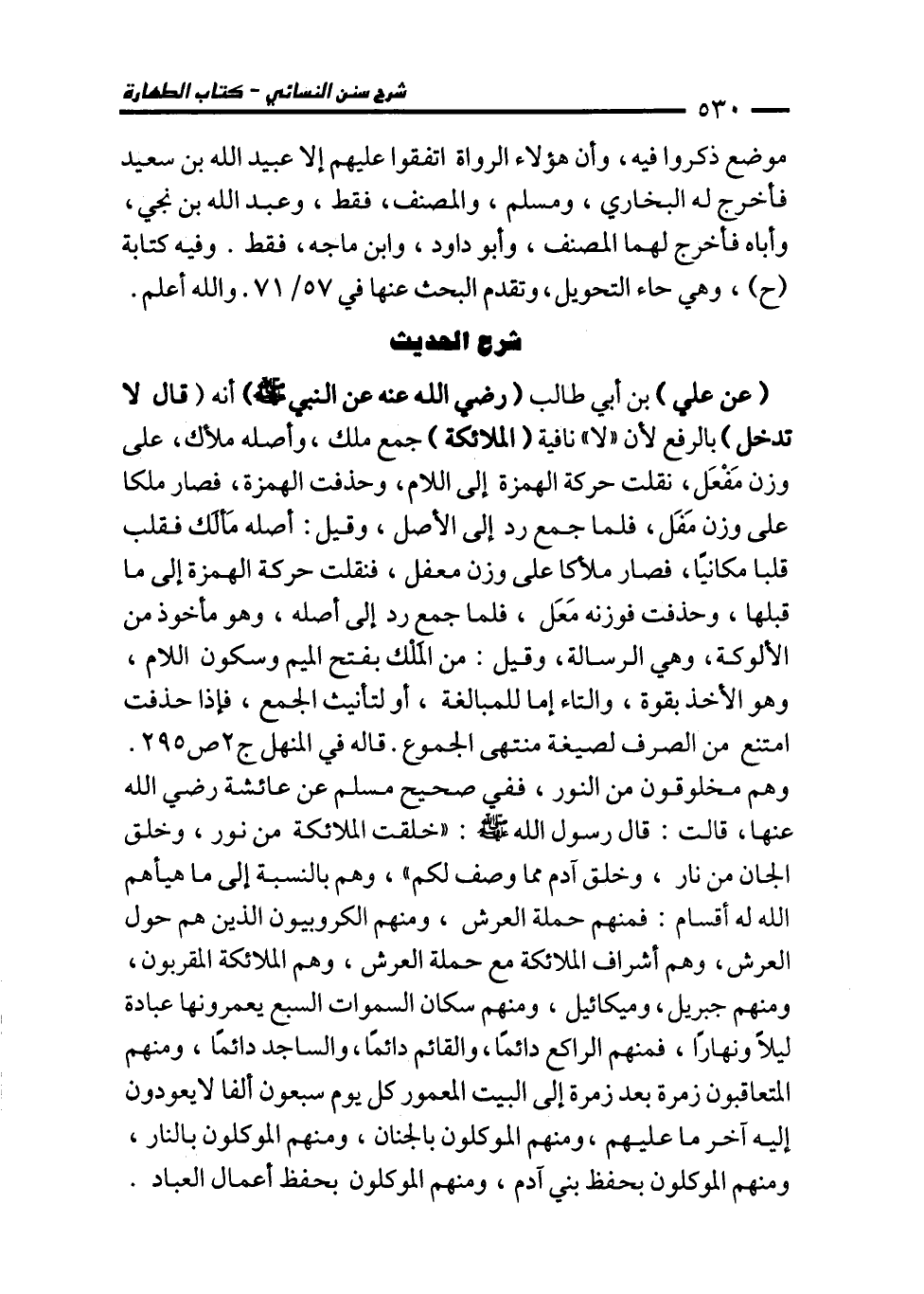 (عن علي) بن أبي طالب (رضي الله عنه عن النبي - صلى الله عليه وسلم -) أنه (قال لا تدخل) بالرفع لأن "لا" نافية (الملائكة) جمع ملك، وأصله ملأك، على وزن مَفْعَل، نقلت حركة الهمزة إلى اللام، وحذفت الهمزة، فصار ملكا على وزن مَفَل، فلما جمع رد إلى الأصل، وقيل: أصله مَألَك فقلب قلبا مكانيًا، فصار ملأكا على وزن معفل، فنقلت حركة الهمزة إلى ما قبلها، وحذفت فوزنه مَعَل، فلما جمع رد إلى أصله، وهو مأخوذ من الألوكة، وهي الرسالة، وقيل: من المَلْك بفتح الميم وسكون اللام، وهو الأخذ بقوة، والتاء إما للمبالغة، أو لتأنيث الجمع، فإذا حذفت امتنع من الصرف لصيغة منتهى المجموع. قاله في المنهل ج 2 ص 295. وهم مخلوقون من النور، ففي صحيح مسلم عن عائشة رضي الله عنها، قالت: قال رسول الله - صلى الله عليه وسلم -: "خلقت الملائكة من نور، وخلق الجان من نار، وخلق آدم مما وصف لكم"، وهم بالنسبة إلى ما هيأهم الله له أقسام: فمنهم حملة العرش، ومنهم الكروبيون الذين هم حول العرش، وهم أشراف الملائكة مع حملة العرش، وهم الملائكة المقربون، ومنهم جبريل، وميكائيل، ومنهم سكان السموات السبع يعمرونها عبادة ليلًا ونهارًا، فمنهم الراكع دائمًا، والقائم دائمًا، والساجد دائمًا، ومنهم المتعاقبون زمرة بعد زمرة إلى البيت المعمور كل يوم سبعون ألفا لا يعودون إليه آخر ما عليهم، ومنهم الموكلون بالجنان، ومنهم الموكلون بالنار، ومنهم الموكلون بحفظ بني آدم، ومنهم الموكلون بحفظ أعمال العباد.