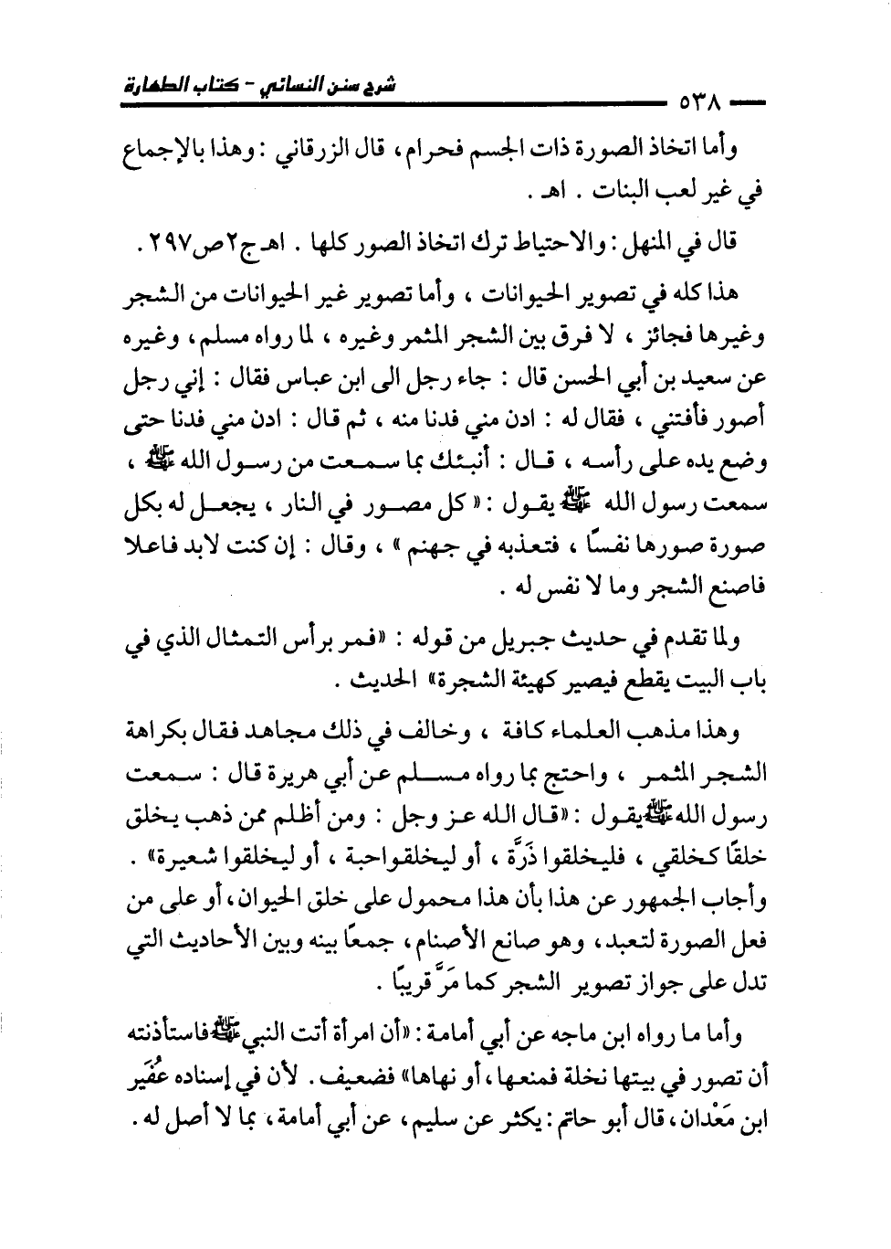 هذا كله في تصوير الحيوانات، وأما تصوير غير الحيوانات من الشجر وغيرها فجائز، لا فرق بين الشجر المثمر وغيره، لما رواه مسلم، وغيره عن سعيد بن أبي الحسن قال: جاء رجل إلى ابن عباس فقال: إني رجل أصور فأفتني، فقال له: ادن مني فدنا منه، ثم قال: ادن مني فدنا حتى وضع يده على رأسه، قال: أنبئك بما سمعت من رسول الله - صلى الله عليه وسلم -، سمعت رسول الله - صلى الله عليه وسلم - يقول: "كل مصور في النار، يجعل له بكل صورة صورها نفسًا، فتعذبه في جهنم"، وقال: إن كنت لابد فاعلا فاصنع الشجر وما لا نفس له.