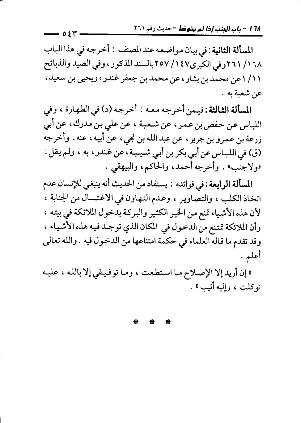 المسألة الثانية: في بيان مواضعه عند الصنف: أخرجه في هذا الباب 168/ 261 وفي الكبرى 147/ 257 بالسند المذكور، وفي الصيد والذبائح 11/ 1 عن محمَّد بن بشار، عن محمَّد بن جعفر غندر، ويحيى بن سعيد، عن شعبة به.