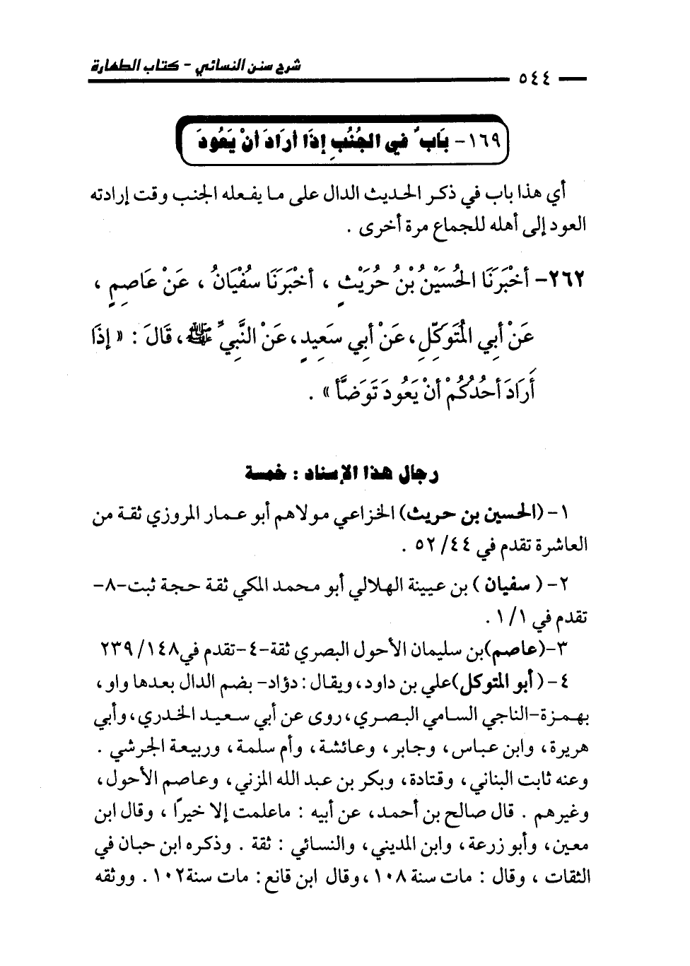 262 - أَخْبَرَنَا الْحُسَيْنُ بْنُ حُرَيْثٍ، حَدَّثَنَا سُفْيَانُ، عَنْ عَاصِمٍ، عَنْ أَبِي الْمُتَوَكِّلِ، عَنْ أَبِي سَعِيدٍ، عَنِ النَّبِيِّ - صلى الله عليه وسلم -، قَالَ: "إِذَا أَرَادَ أَحَدُكُمْ أَنْ يَعُودَ تَوَضَّأَ".