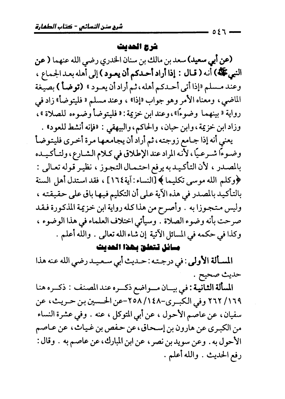 يعني أنه إذا جامع زوجته، ثم أراد أن يجامعها مرة أخرى فليتوضأ وضوءًا شرعيًا؛ لأنه المراد عند الإطلاق في كلام الشارع، ولتأكيده بالمصدر, لأن التأكيد به يرفع احتمال التجوز، نظير قوله تعالى: {وَكَلَّمَ اللَّهُ مُوسَى تَكْلِيمًا} [النساء: 164]، فقد استدل أهل السنة بالتأكيد بالمصدر في هذه الآية على أن التكليم فيها باق على حقيقته، وليس متجوزا به. وأصرح من هذا كله رواية ابن خزيمة المذكورة فقد صرحت بأنه وضوء الصلاة. وسيأتي اختلاف العلماء في هذا الوضوء، وكذا في حكمه في المسائل الآتية إن شاء الله تعالى. والله أعلم.