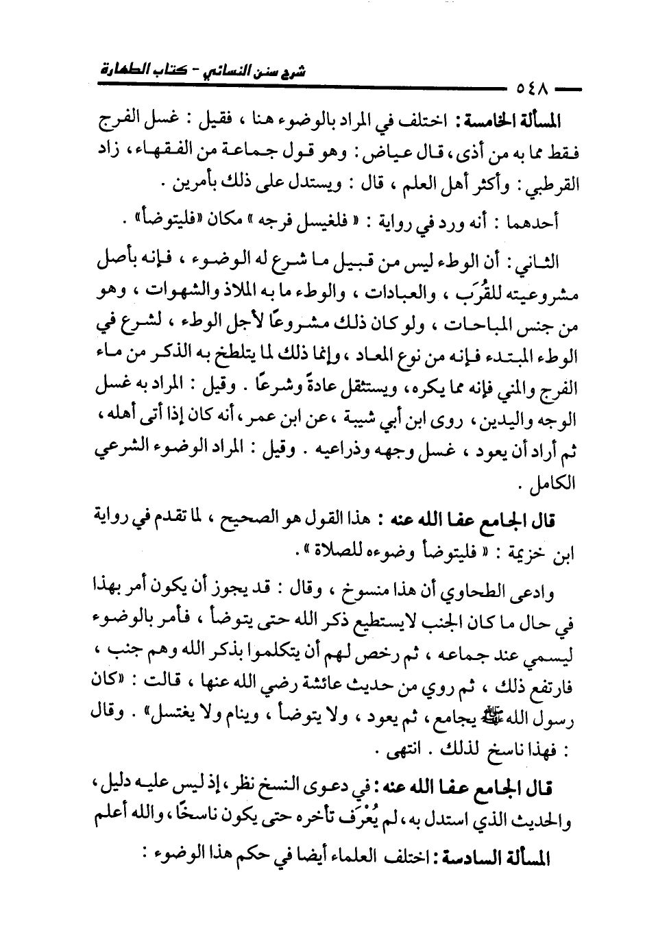 المسألة الخامسة: اختلف في المراد بالوضوء هنا، فقيل: غسل الفرج فقط مما به من أذى، قال عياض: وهو قول جماعة من الفقهاء، زاد القرطبي: وأكثر أهل العلم، قال: ويستدل على ذلك بأمرين. أحدهما: أنه ورد في رواية: "فليغسل فرجه" مكان "فليتوضأ".