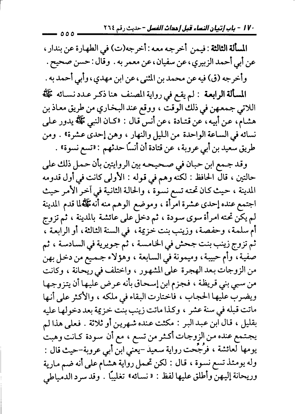 المسألة الرابعة: لم يقع في رواية المصنف هنا ذكر عدد نسائه - صلى الله عليه وسلم - اللاتي جمعهن في ذلك الوقت، ووقع عند البخاري من طريق معاذ بن هشام، عن أبيه، عن قتادة، عن أنس قال: "كان النبي - صلى الله عليه وسلم - يدور على نسائه في الساعة الواحدة من الليل والنهار، وهن إحدى عشرة". ومن طريق سعيد بن أبي عروبة، عن قتادة أن أنسًا حدثهم: "تسع نسوة".
