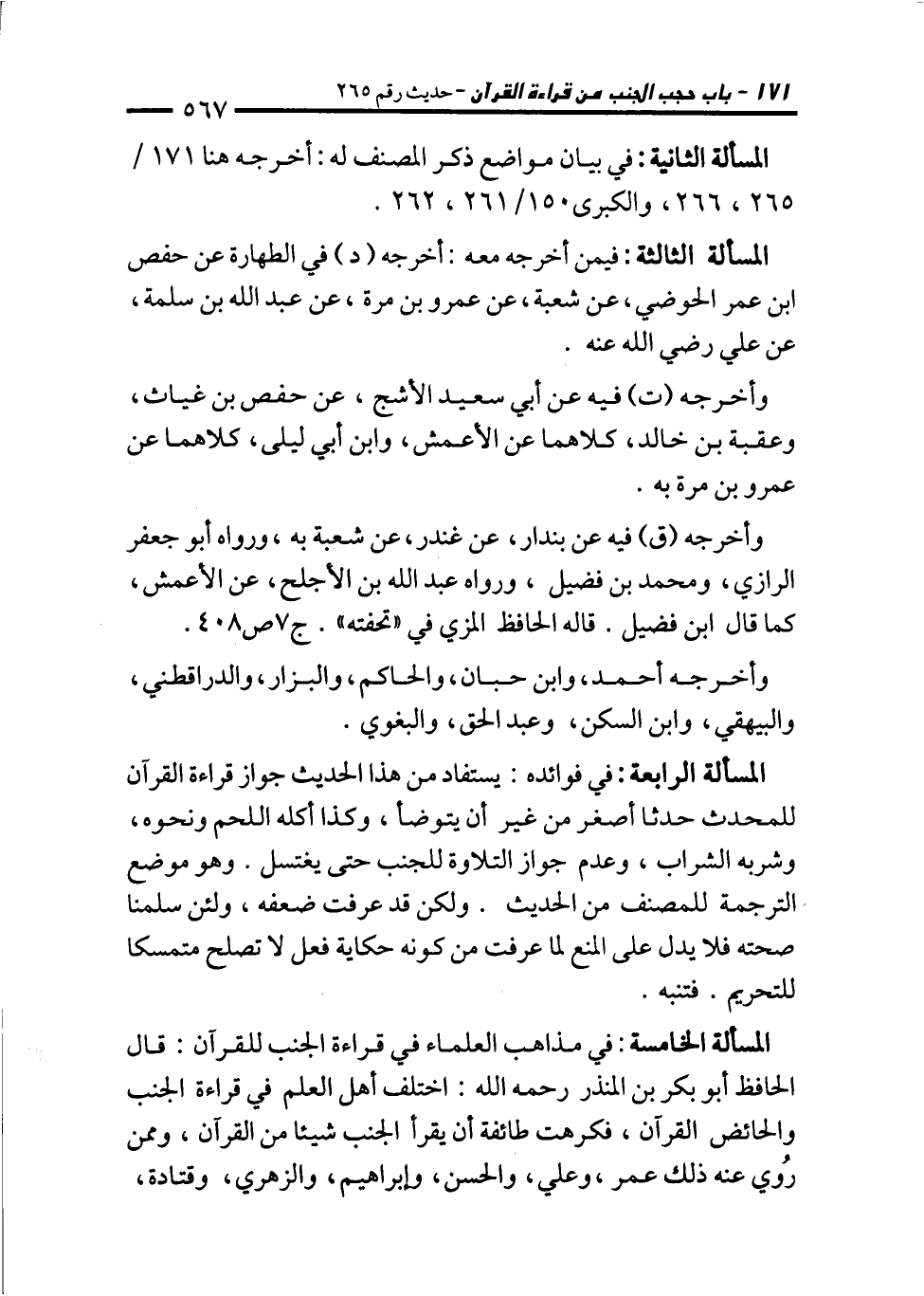 المسألة الخامسة: في مذاهب العلماء في قراءة الجنب للقرآن: قال الحافظ أبو بكر بن المنذر رحمه الله: اختلف أهل العلم في قراءة الجنب والحائض القرآن، فكرهت طائفة أن يقرأ الجنب شيئا من القرآن، وممن رُوي عنه ذلك عمر، وعلي، والحسن، وإبراهيم، والزهري، وقتادة،