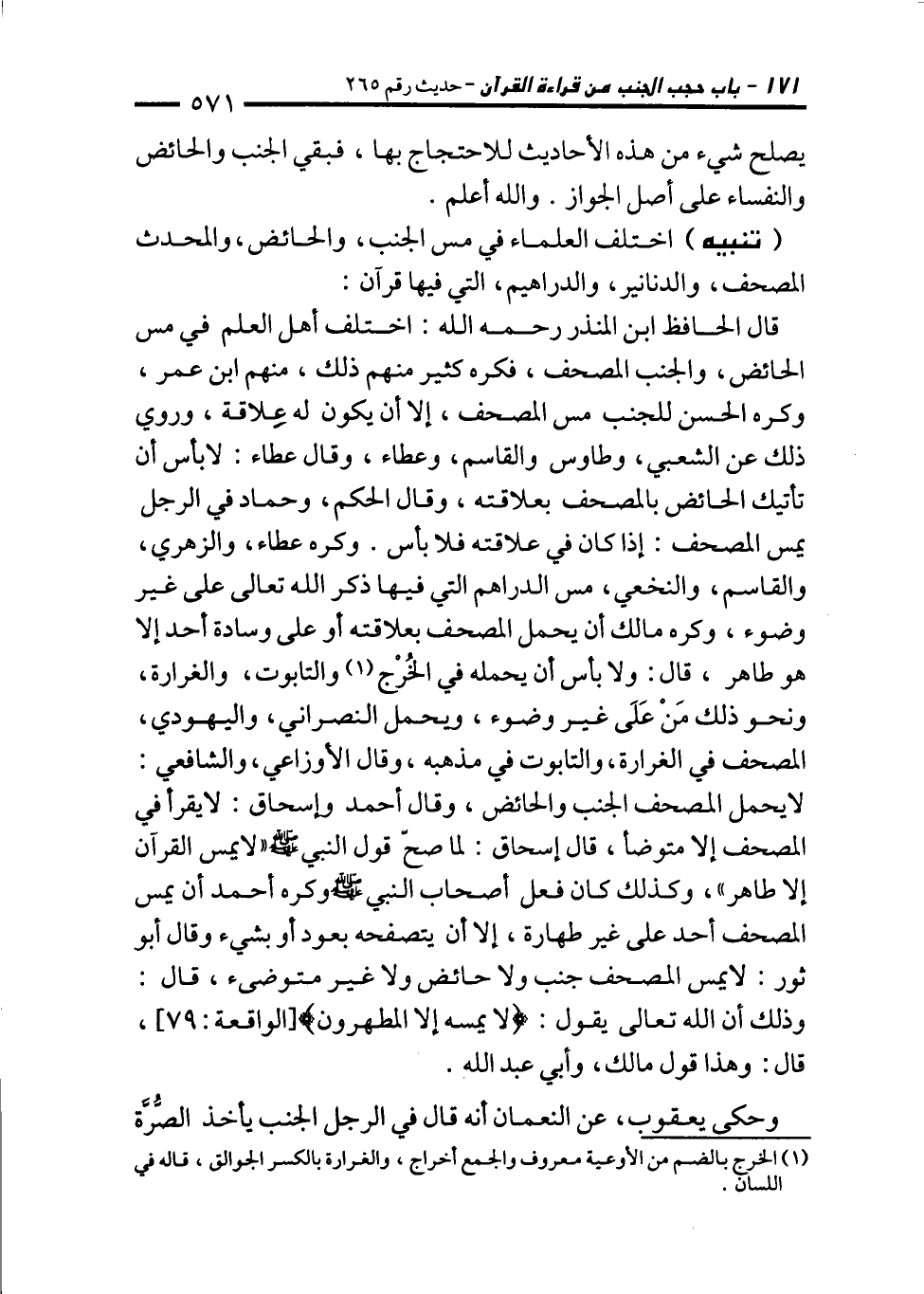 قال الحافظ ابن المنذر رحمه الله: اختلف أهل العلم في مس الحائض، والجنب المصحف، فكره كثير منهم ذلك، منهم ابن عمر، وكره الحسن للجنب مس المصحف، إلا أن يكون له عِلاقة، وروي ذلك عن الشعبي، وطاوس والقاسم، وعطاء، وقال عطاء: لا بأس أن تأتيك الحائض بالمصحف بعلاقته، وقال الحكم، وحماد في الرجل يمس المصحف: إذا كان في علاقته فلا بأس. وكره عطاء، والزهري، والقاسم، والنخعي، مس الدراهم التي فيها ذكر الله تعالى على غير وضوء، وكره مالك أن يحمل المصحف بعلاقته أو على وسادة أحد إلا هو طاهر، قال: ولا بأس أن يحمله في الخُرْج (¬1) والتابوت، والغرارة، ونحو ذلك مَنْ عَلَى غير وضوء، ويحمل النصراني، واليهودي، المصحف في الغرارة، والتابوت في مذهبه، وقال الأوزاعي، والشافعي: لا يحمل المصحف الجنب والحائض، وقال أحمد وإسحاق: لا يقرأ في المصحف إلا متوضأ، قال إسحاق: لما صحّ قول النبي - صلى الله عليه وسلم - "لا يمس القرآن إلا طاهر"، وكذلك كان فعل أصحاب النبي - صلى الله عليه وسلم - وكره أحمد أن يمس المصحف أحد على غير طهارة، إلا أن يتصفحه بعود أو بشيء وقال أبو ثور: لا يمس المصحف جنب ولا حائض ولا غير متوضئ، قال: وذلك أن الله تعالى يقول: {لَا يَمَسُّهُ إِلَّا الْمُطَهَّرُونَ} [الواقعة: 79]، قال: وهذا قول مالك، وأبي عبد الله.
