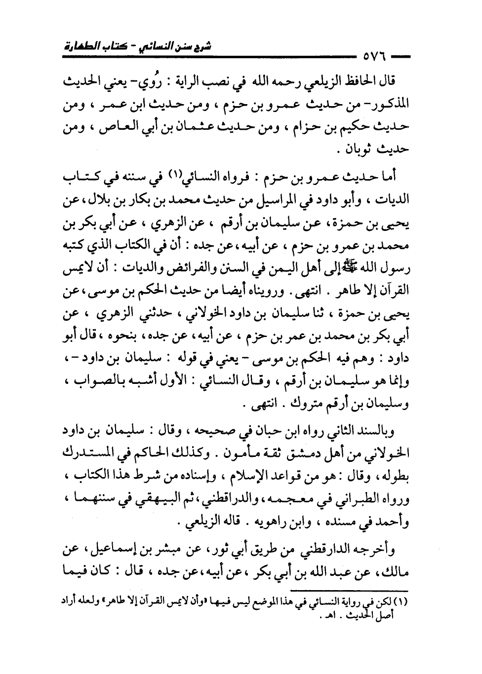 (¬1) لكن في رواية النسائي في هذا الموضع ليس فيها "وأن لا يمس القرآن إلا طاهر" ولعله أراد أصل الحديث. اهـ.