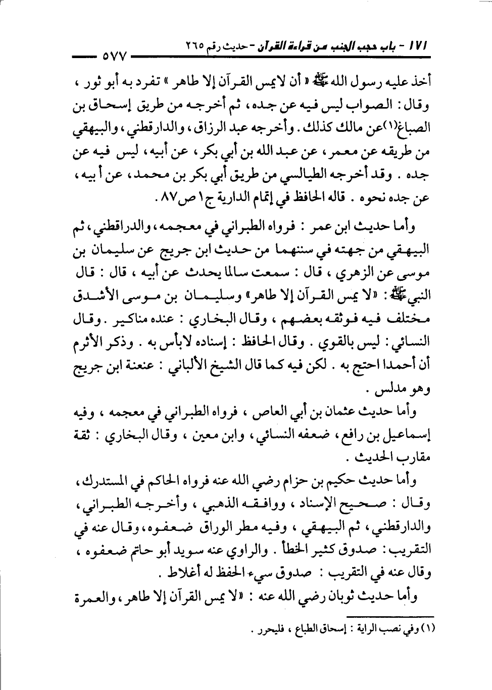 وأما حديث ابن عمر: فرواه الطبراني في معجمه، والدراقطني، ثم البيهقي من جهته في سننهما من حديث ابن جريج عن سليمان بن موسى عن الزهري، قال: سمعت سالما يحدث عن أبيه، قال: قال النبي - صلى الله عليه وسلم -: "لا يمس القرآن إلا طاهر" وسليمان بن موسى الأشدق مختلف فيه فوثقه بعضهم، وقال البخاري: عنده مناكير. وقال النسائي: ليس بالقوي. وقال الحافظ: إسناده لا بأس به. وذكر الأثرم أن أحمدا احتج به. لكن فيه كما قال الشيخ الألباني: عنعنة ابن جريج وهو مدلس.