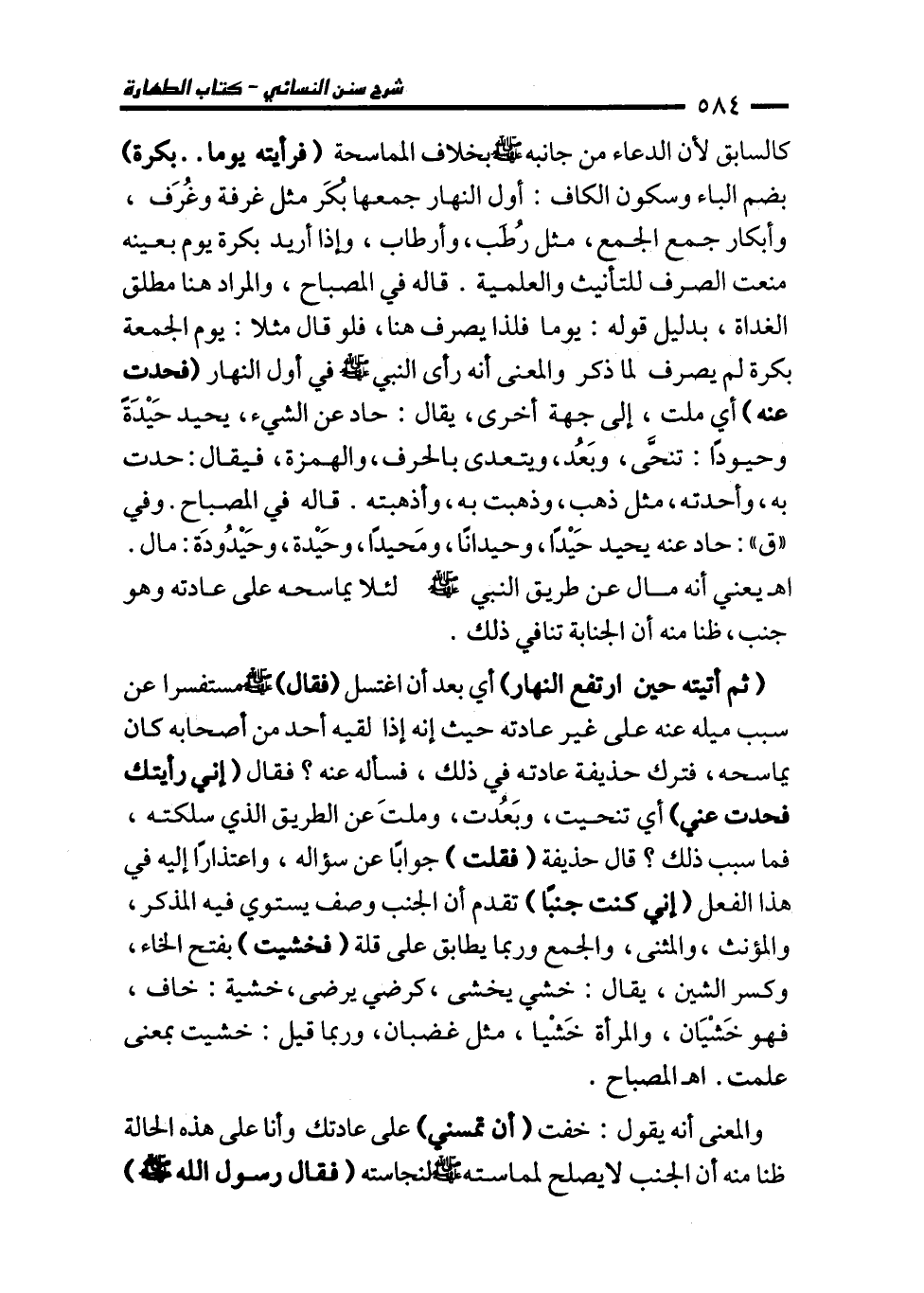 (ثم أتيته حين ارتفع النهار) أي بعد أن اغتسل (فقال) - صلى الله عليه وسلم - مستفسرا عن سبب ميله عنه على غير عادته حيث إنه إذا لقيه أحد من أصحابه كان يماسحه، فترك حذيفة عادته في ذلك، فسأله عنه؟ فقال (إني رأيتك فحدت عني) أي تنحيت، وبَعُدت، وملتَ عن الطريق الذي سلكته، فما سبب ذلك؟ قال حذيفة (فقلت) جوابًا عن سؤاله، واعتذارًا إليه في هذا الفعل (إني كنت جنبًا) تقدم أن الجنب وصف يستوي فيه المذكر، والمؤنث، والمثنى، والجمع وربما يطابق علي قلة (فخشيت) بفتح الخاء، وكسر الشين، يقال: خشي يخشى، كرضي يرضى، خشية: خاف، فهو خَشْيَان، والمرأة خَشْيا، مثل غضبان، وربما قيل: خشيت بمعنى علمت. اهـ المصباح.