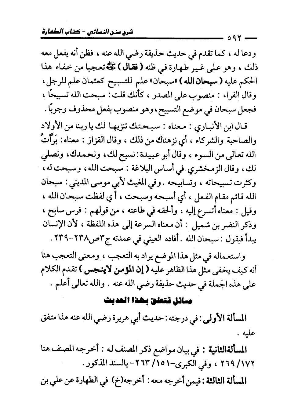 ودعا له، كما تقدم في حديث حذيفة رضي الله عنه، فظن أنه يفعل معه ذلك، وهو على غير طهارة في ظنه (فقال) - صلى الله عليه وسلم - تعجبا من خفاء هذا الحكم عليه (سبحان الله) "سبحان" علم للتسبيح كعثمان علم للرجل، وقال الفراء: منصوب على المصدر، كأنك قلت: سبحت الله تسبيحًا، فجعل سبحان في موضع التسبيح، وهو منصوب بفعل محذوف وجوبًا.