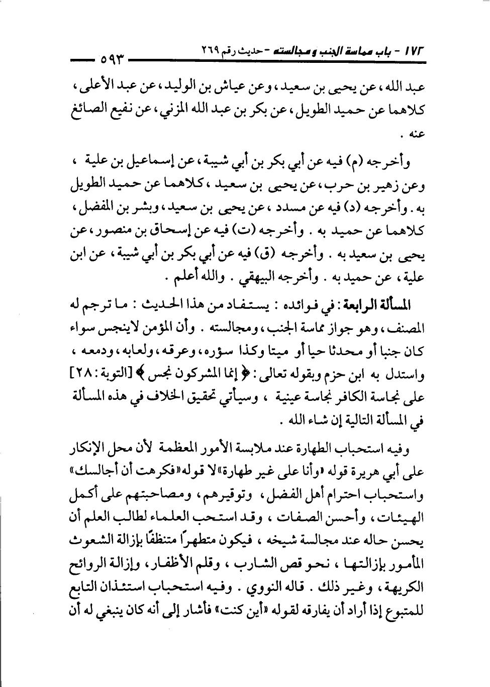 المسألة الرابعة: في فوائده: يستفاد من هذا الحديث: ما ترجم له المصنف، وهو جواز مماسة الجنب، ومجالسته. وأن المؤمن لا ينجس سواء كان جنبا أو محدثا حيا أو ميتا وكذا سؤره، وعرقه، ولعابه، ودمعه، واستدل به ابن حزم وبقوله تعالى: {إِنَّمَا الْمُشْرِكُونَ نَجَسٌ} [التوبة: 28] على نجاسة الكافر نجاسة عينية، وسيأتي تحقيق الخلاف في هذه المسألة في المسألة التالية إن شاء الله.