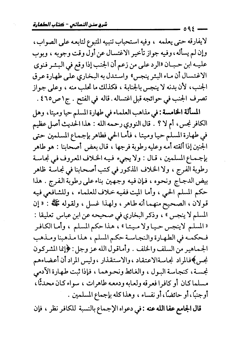 المسألة الخامسة: في مذاهب العلماء في طهارة المسلم حيا وميتا، وهل الكافر نجس, أم لا؟. قال النووي رحمه الله: هذا الحديث أصل عظيم في طهارة المسلم حيا وميتا، فأما الحي فطاهر بإجماع المسلمين حتى الجنين إذا ألقته أمه وعليه رطوبة فرجها، قال بعض أصحابنا: هو طاهر بإجماع المسلمين، قال: ولا يجيء فيه الخلاف المعروف في نجاسة رطوبة الفرج، ولا الخلاف المذكور في كتب أصحابنا في نجاسة ظاهر بيض الدجاج ونحوه، فإن فيه وجهين بناء على رطوبة الفرج. هذا حكم المسلم الحي، وأما الميت ففيه خلاف للعلماء، وللشافعي فيه قولان، الصحيح منهما أنه طاهر، ولهذا غسل، ولقوله - صلى الله عليه وسلم -: "إن المسلم لا ينجس"، وذكر البخاري في صحيحه عن ابن عباس تعليقا: "المسلم لا ينجس حيا ولا ميتا"، هذا حكم المسلم، وأما الكافر فحكمه في الطهارة والنجاسة حكم المسلم، هذا مذهبنا ومذهب الجماهير من السلف والخلف. وأما قول الله عز وجل: {إِنَّمَا الْمُشْرِكُونَ نَجَسٌ} فالمراد نجاسة الاعتقاد، والاستقذار، وليس المراد أن أعضاءهم نجسة، كنجاسة البول، والغائط ونحوهما، فإذا ثبت طهارة الآدمي مسلما كان أو كافرا فعرقه ولعابه ودمعه طاهرات، سواء كان محدثًا، أو جنبًا، أو حائضًا، أو نفساء، وهذا كله بإجماع المسلمين.