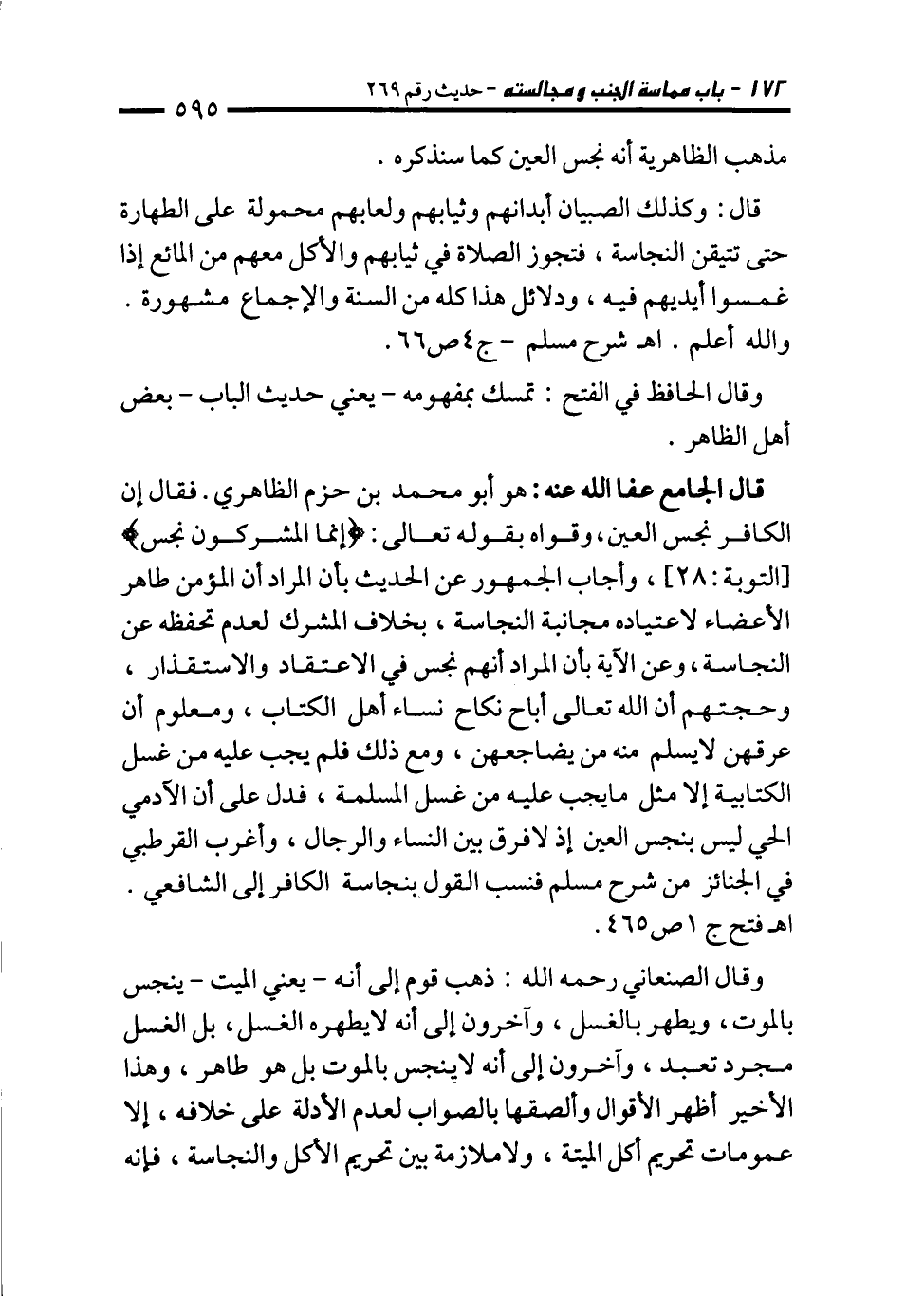قال الجامع عفا الله عنه: هو أبو محمَّد بن حزم الظاهري. فقال إن الكافر نجس العين، وقواه بقوله تعالى: {إِنَّمَا الْمُشْرِكُونَ نَجَسٌ} [التوبة: 28]، وأجاب الجمهور عن الحديث بأن المراد أن المؤمن طاهر الأعضاء لاعتياده مجانبة النجاسة، بخلاف المشرك لعدم تحفظه عن النجاسة، وعن الآية بأن المراد أنهم نجس في الاعتقاد والاستقذار، وحجتهم أن الله تعالى أباح نكاح نساء أهل الكتاب، ومعلوم أن