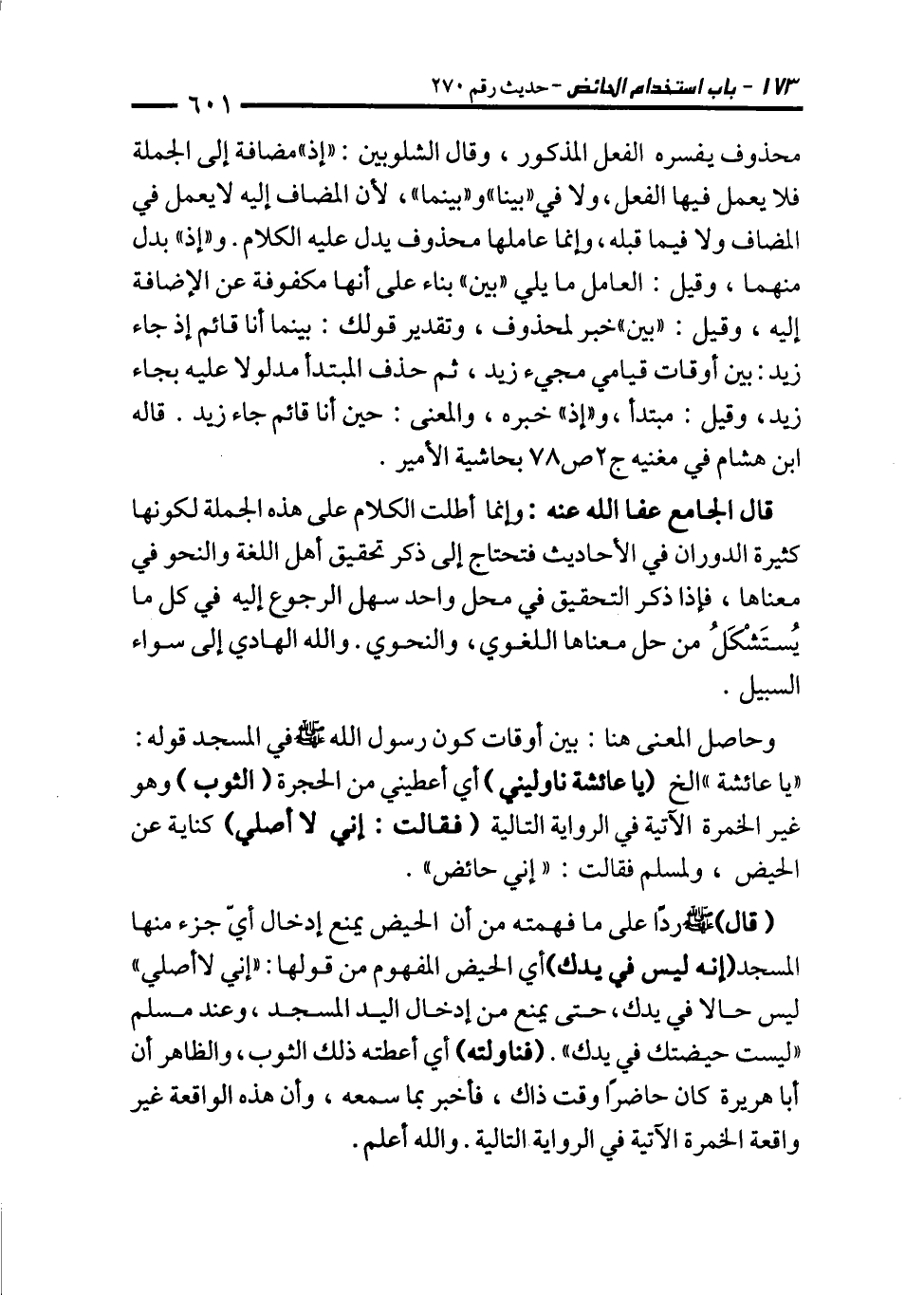 وحاصل المعنى هنا: بين أوقات كون رسول الله - صلى الله عليه وسلم - في المسجد قوله: "يا عائشة" الخ (يا عائشة ناوليني) أي أعطيني من الحجرة (الثوب) وهو غير الخمرة الآتية في الرواية التالية (فقالت: إني لا أصلي) كناية عن الحيض، ولمسلم فقالت: "إني حائض".