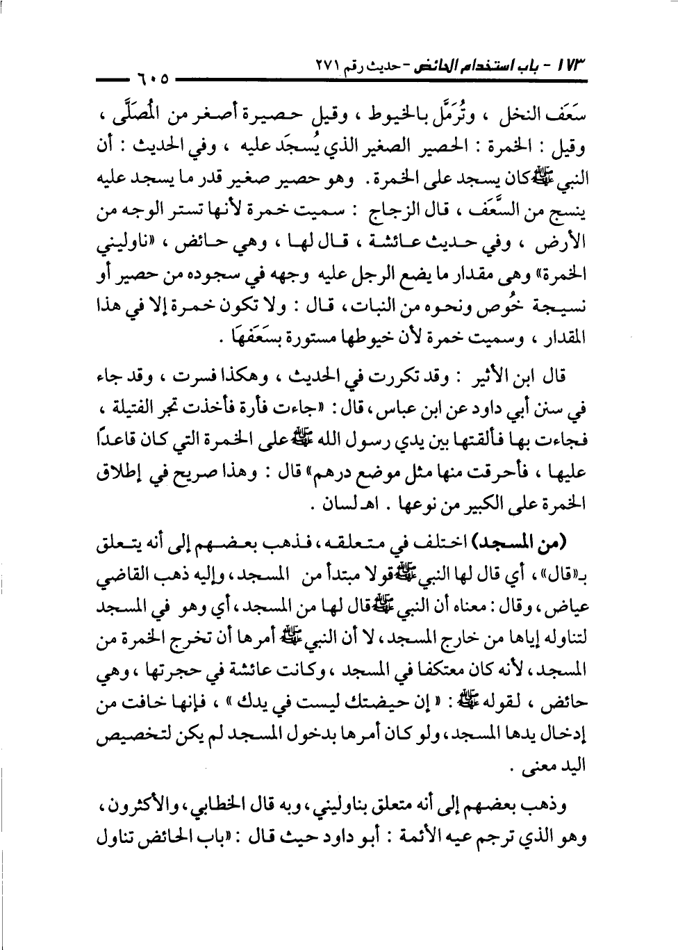 قال ابن الأثير: وقد تكررت في الحديث، وهكذا فسرت، وقد جاء في سنن أبي داود عن ابن عباس، قال: "جاءت فأرة فأخذت تجر الفتيلة، فجاءت بها فألقتها بين يدي رسول الله - صلى الله عليه وسلم - على الخمرة التي كان قاعدًا عليها، فأحرقت منها مثل موضع درهم" قال: وهذا صريح في إطلاق