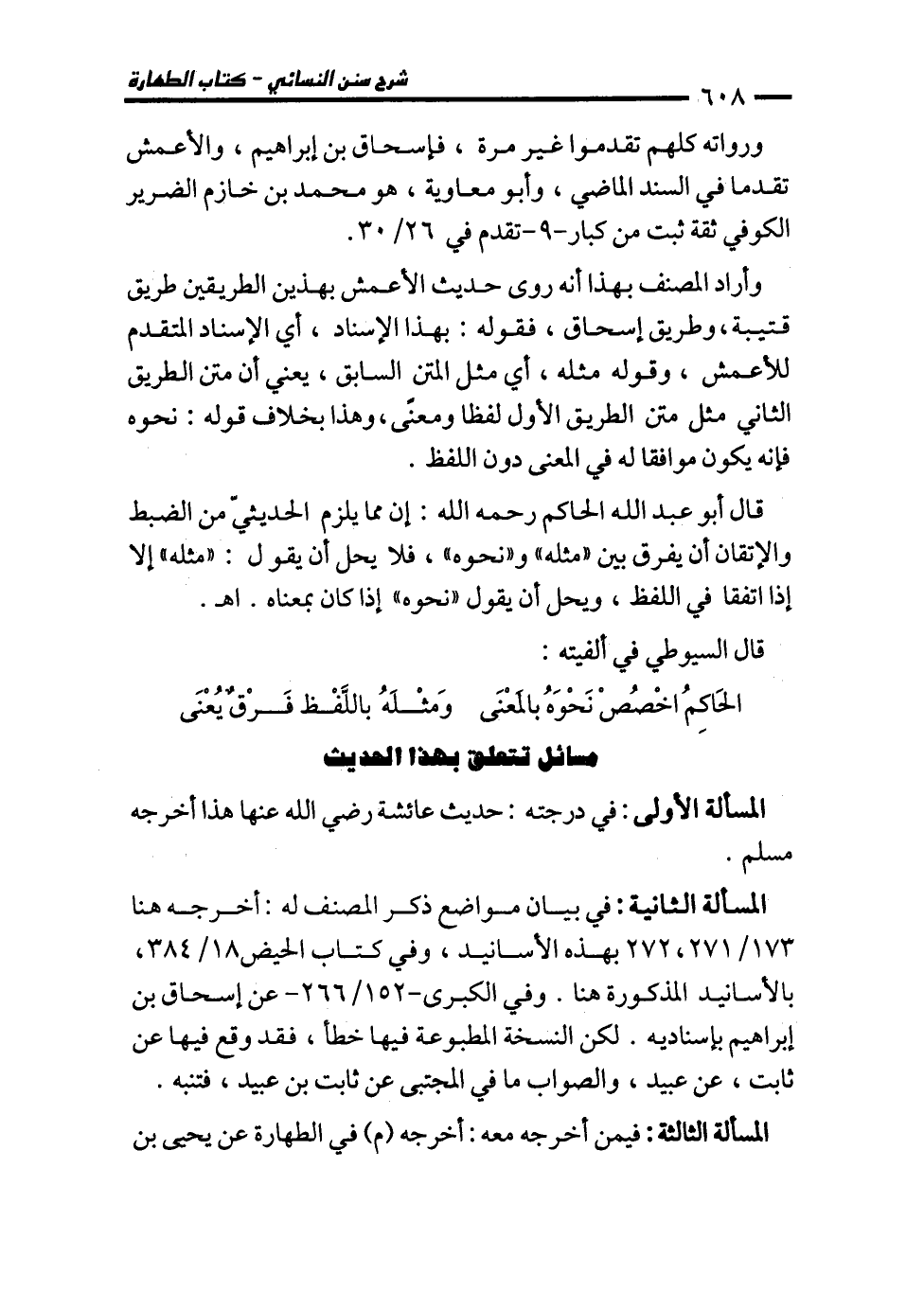 المسألة الثانية: في بيان مواضع ذكر المصنف له: أخرجه هنا 173/ 271، 272 بهذه الأسانيد، وفي كتاب الحيض 18/ 384، بالأسانيد المذكورة هنا. وفي الكبرى -152/ 266 - عن إسحاق بن إبراهيم بإسناديه. لكن النسخة المطبوعة فيها خطأ، فقد وقع فيها عن ثابت، عن عبيد، والصواب ما في المجتبى عن ثابت بن عبيد، فتنبه.