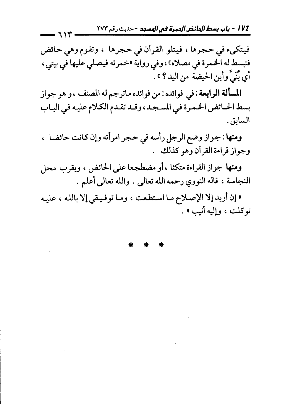 المسألة الرابعة: في فوائده: من فوائده ما ترجم له المصنف، وهو جواز بسط الحائض الخمرة في المسجد، وقد تقدم الكلام عليه في الباب السابق.