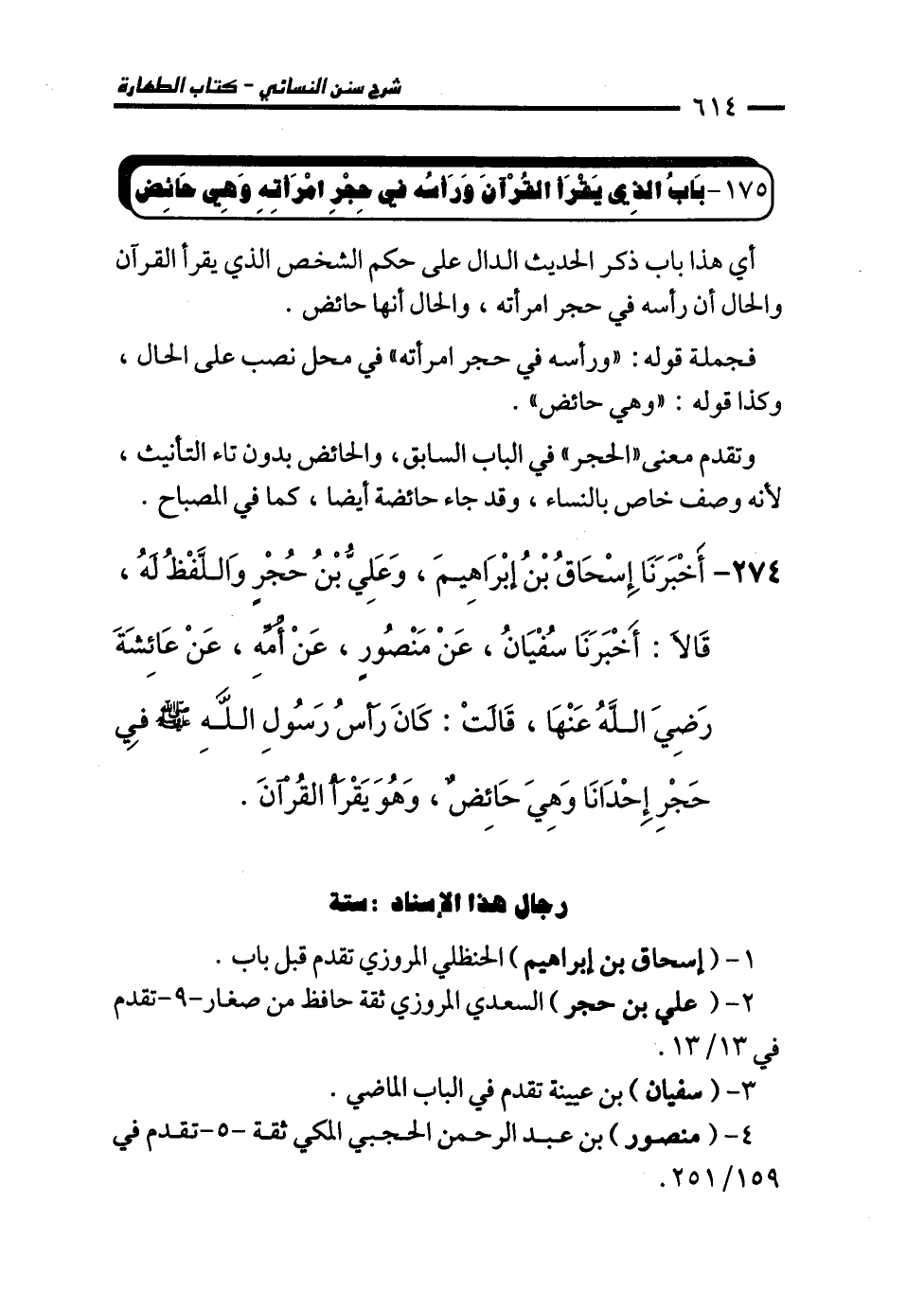 274 - أَخْبَرَنَا إِسْحَاقُ بْنُ إِبْرَاهِيمَ، وَعَلِيُّ بْنُ حُجْرٍ وَاللَّفْظُ لَهُ، قَالَا: أَخْبَرَنَا سُفْيَانُ، عَنْ مَنْصُورٍ، عَنْ أُمِّهِ، عَنْ عَائِشَةَ رَضِيَ اللهُ عَنْهَا، قَالَتْ: كَانَ رَأْسُ رَسُولِ اللهِ - صلى الله عليه وسلم - فِي حِجْرِ إِحْدَانَا وَهِيَ حَائِضٌ وَهُوَ يَتْلُو الْقُرْآنَ.