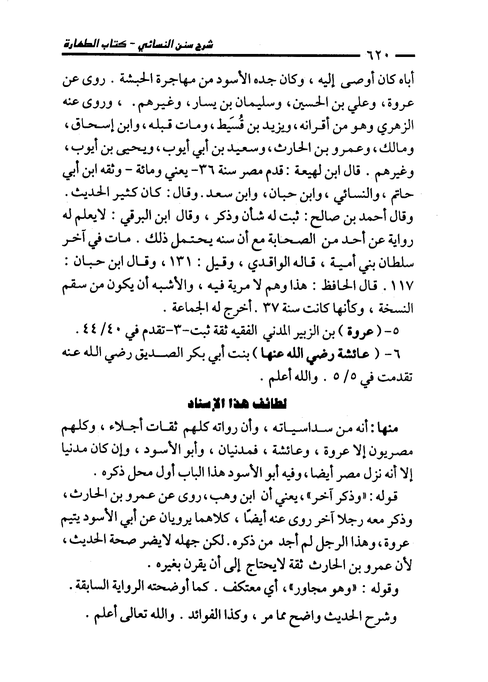 منها: أنه من سداسياته، وأن رواته كلهم ثقات أجلاء، وكلهم مصريون إلا عروة، وعائشة، فمدنيان، وأبو الأسود، وإن كان مدنيا إلا أنه نزل مصر أيضا، وفيه أبو الأسود هذا الباب أول محل ذكره.