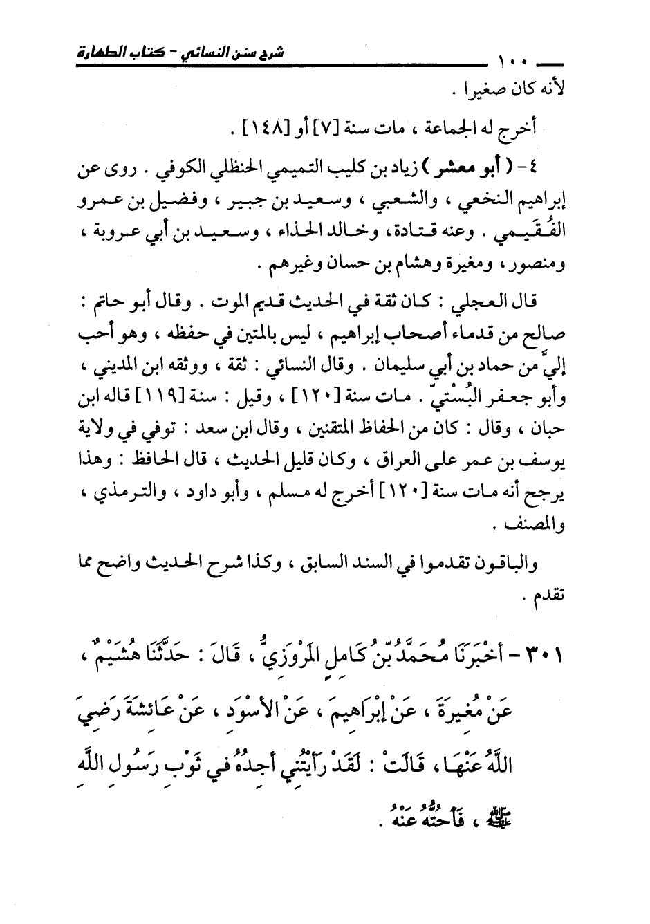 301 - أَخْبَرَنَا مُحَمَّدُ بْنُ كَامِلٍ الْمَرْوَزِيُّ، قَالَ: حَدَّثَنَا هُشَيْمٌ، عَنْ مُغِيرَةَ، عَنْ إِبْرَاهِيمَ، عَنِ الأَسْوَدِ، عَنْ عَائِشَةَ رَضِيَ اللهُ عَنْهَا، قَالَتْ: لَقَدْ رَأَيْتُنِي أَجِدُهُ فِي ثَوْبِ رَسُولِ اللهِ - صلى الله عليه وسلم - فَأَحُتُّهُ عَنْهُ.